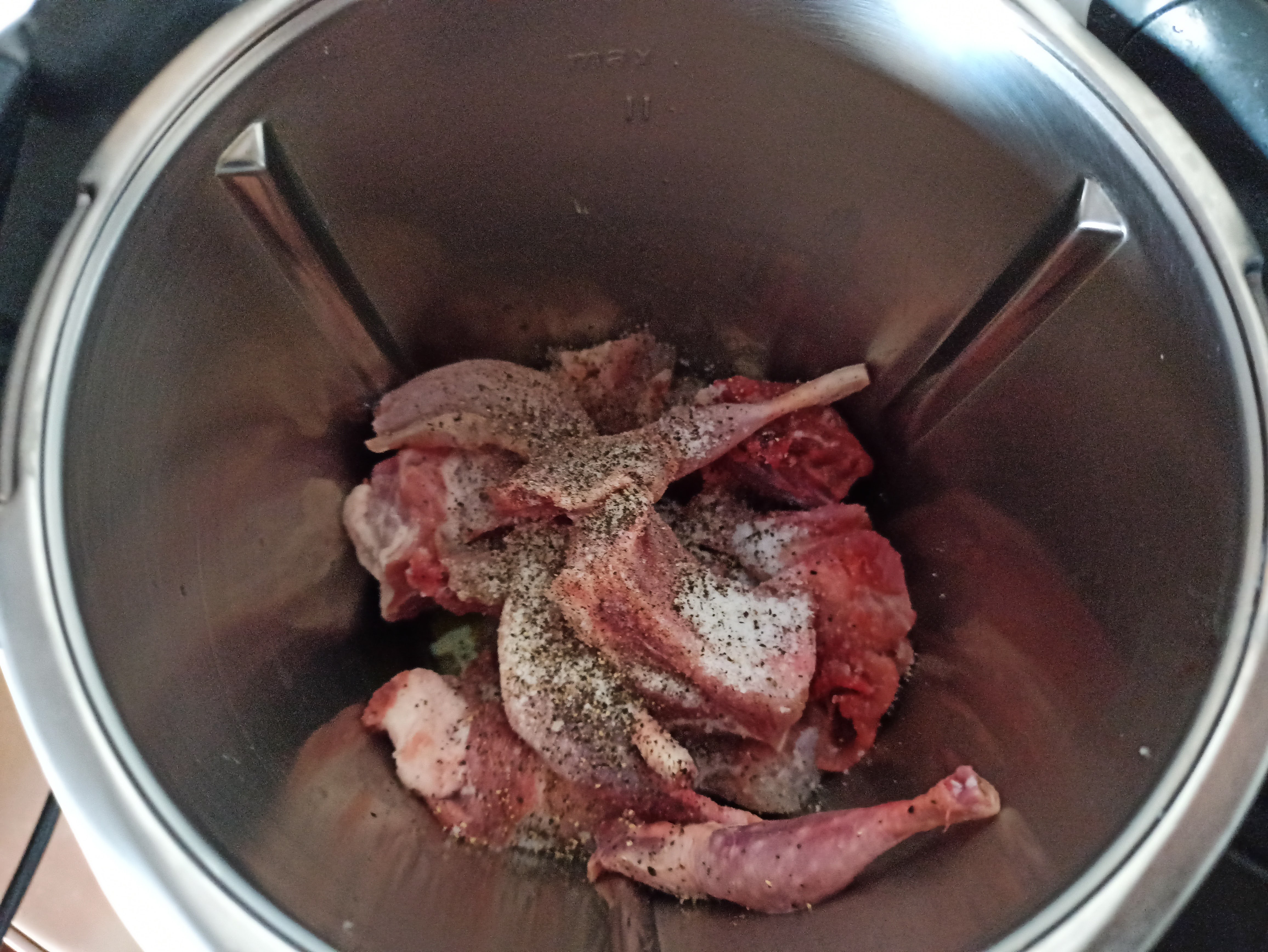 - Añadir el pollo, el conejo, la codorniz, la costilla de cerdo, la sal y la pimienta. Rehogar 7 min / 120° / giro inverso / vel cuchara.