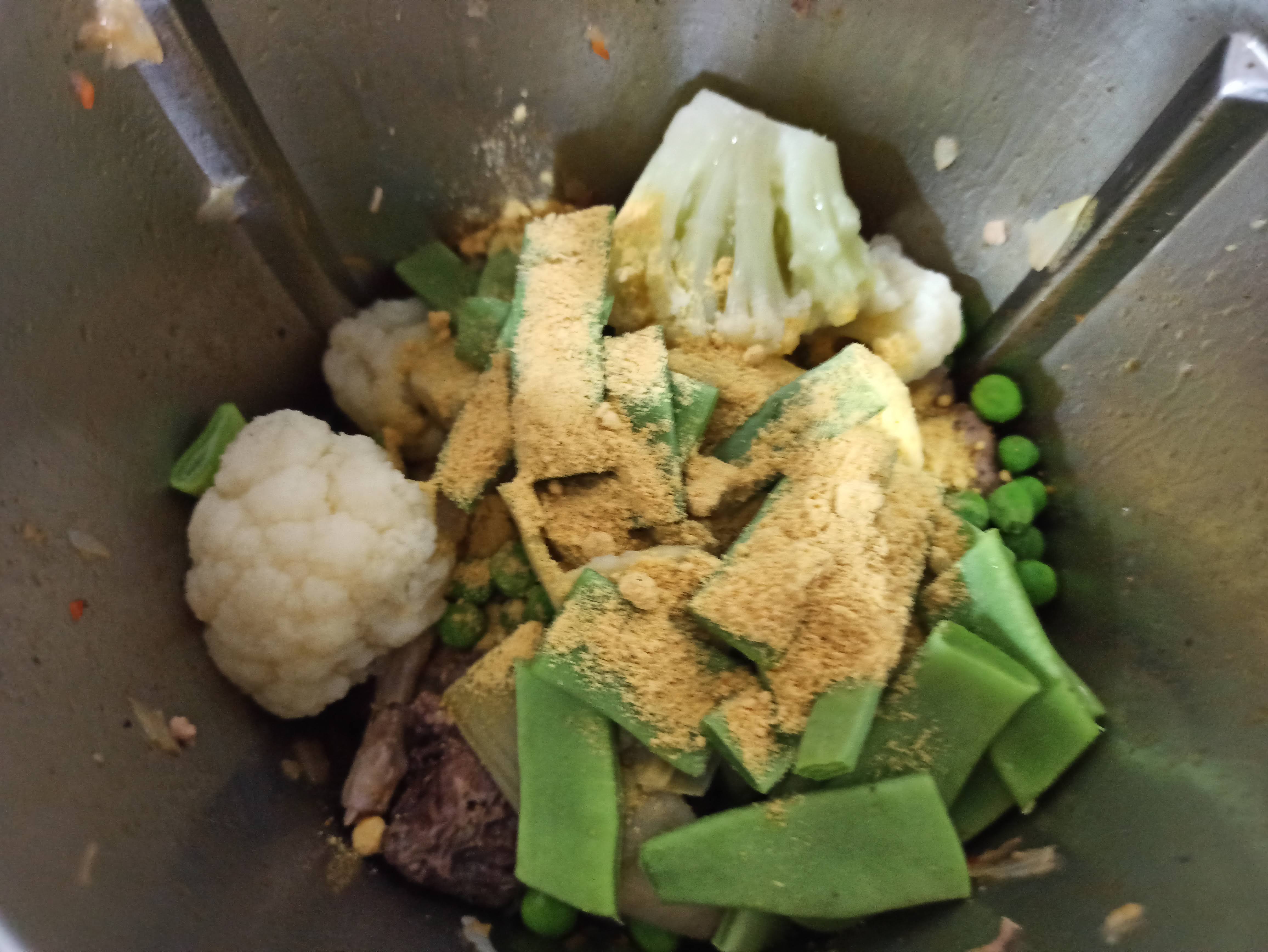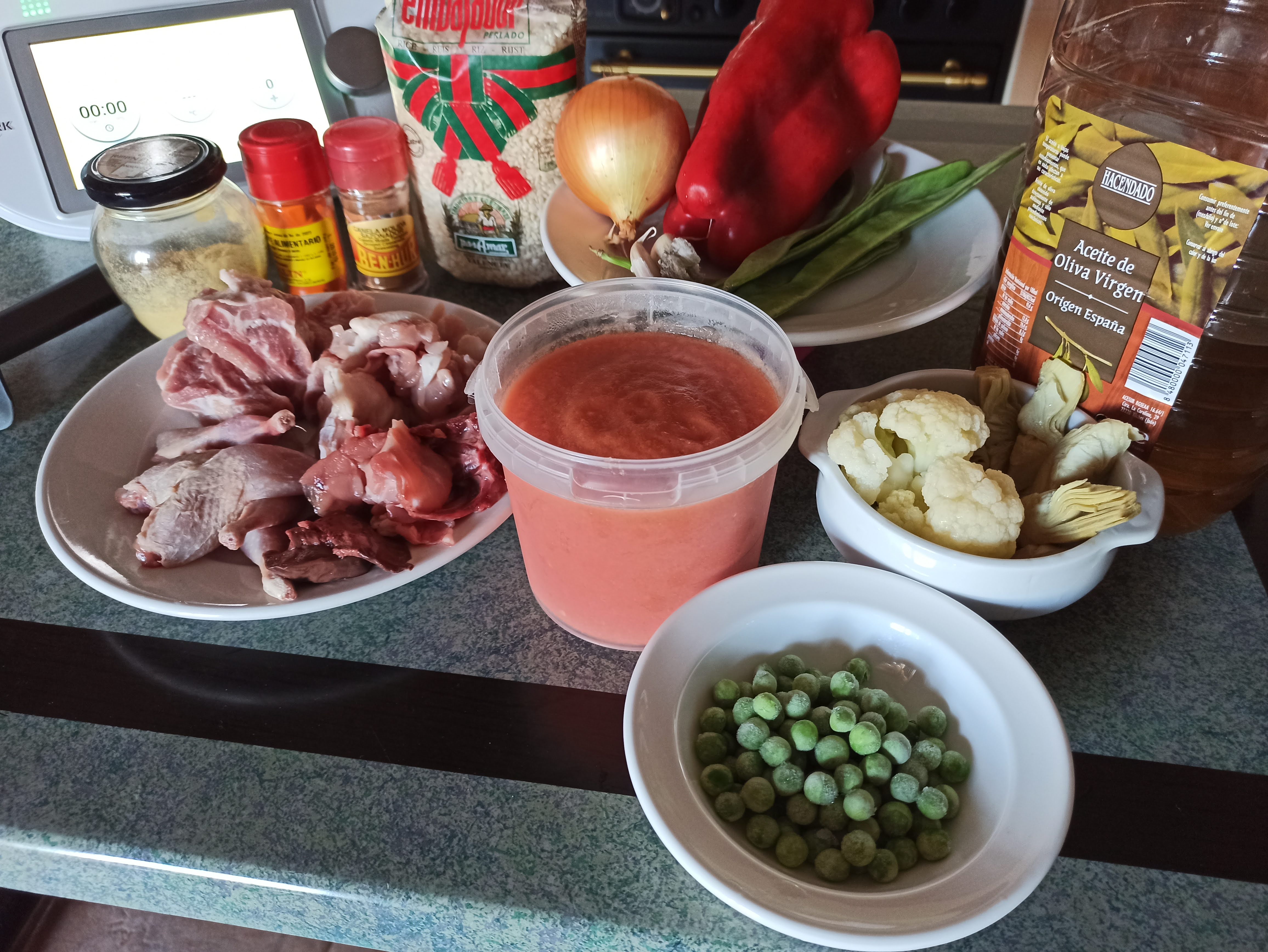- Incorporar la carne reservada, los guisantes, las alcachofas, la coliflor, las judías verdes y el concentrado de pollo. Rehogar 7 min / 120° / giro inverso / vel cuchara.
