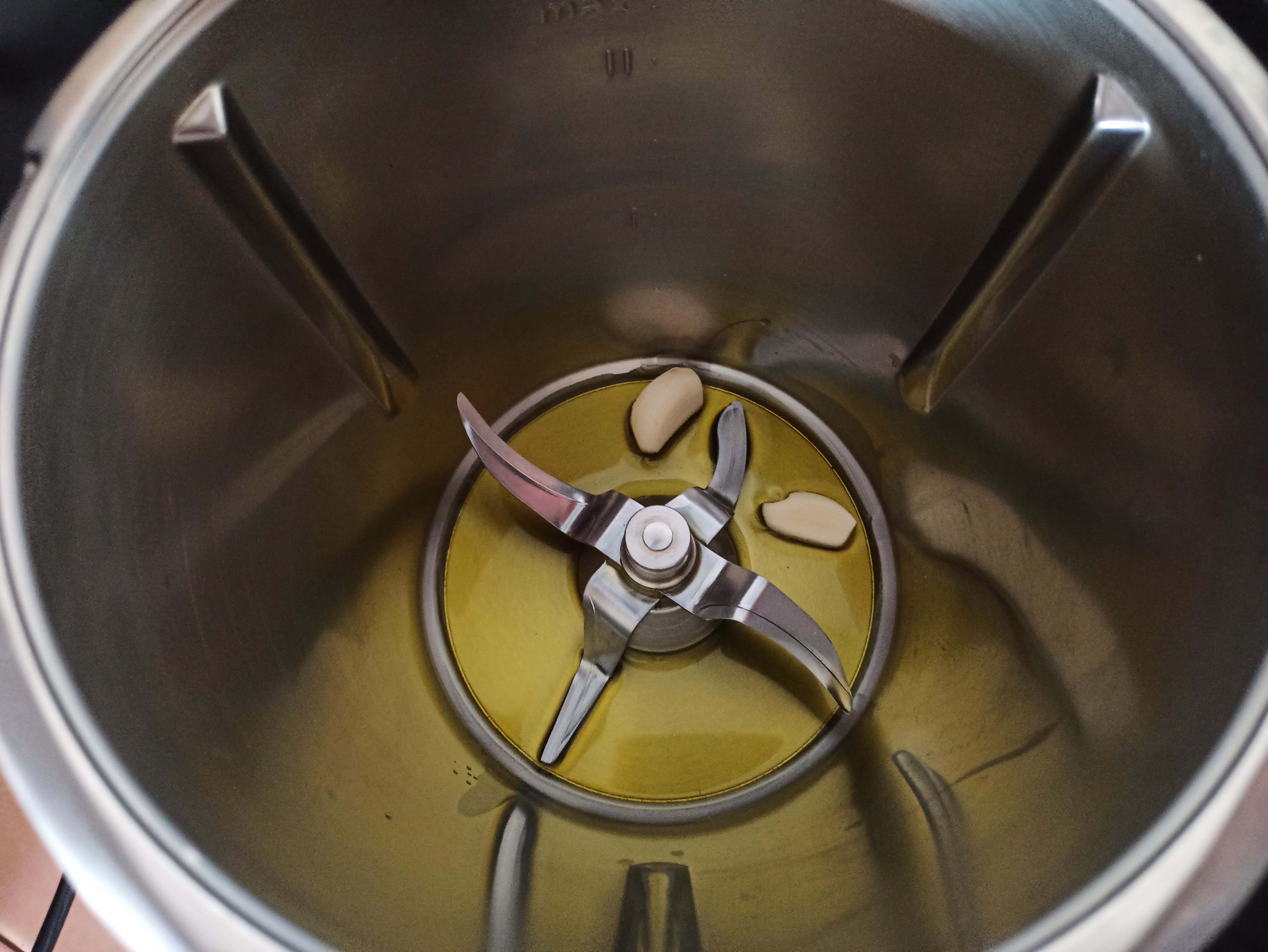 - Poner en el vaso el aceite y los ajos. Sofreir 4 min / 120° / giro inverso / vel cuchara.
