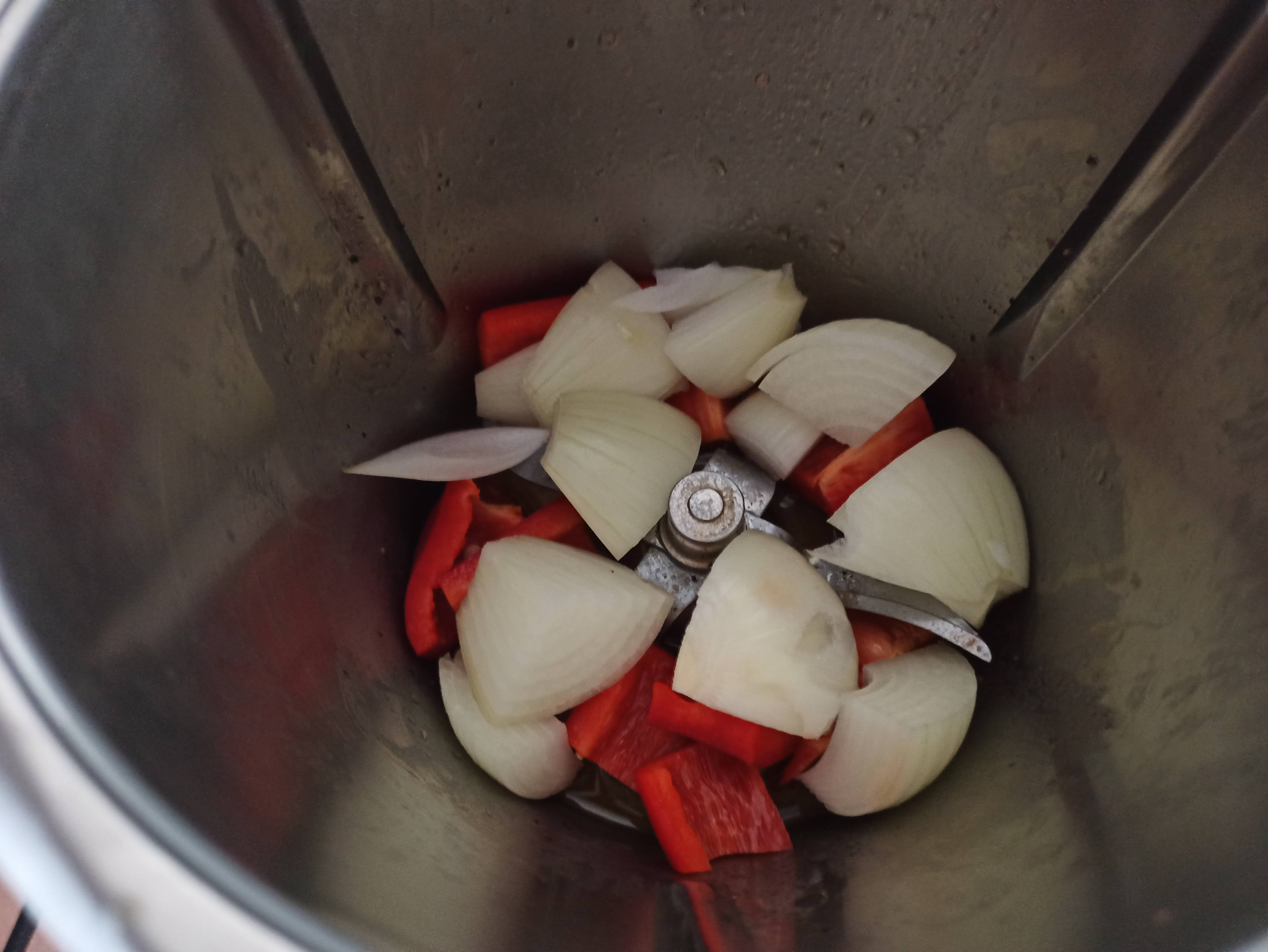 - Incorporar al vaso el pimiento y la cebolla. Trocear 10 seg / vel 4. Sofreir 7 min / 120° / vel 1.