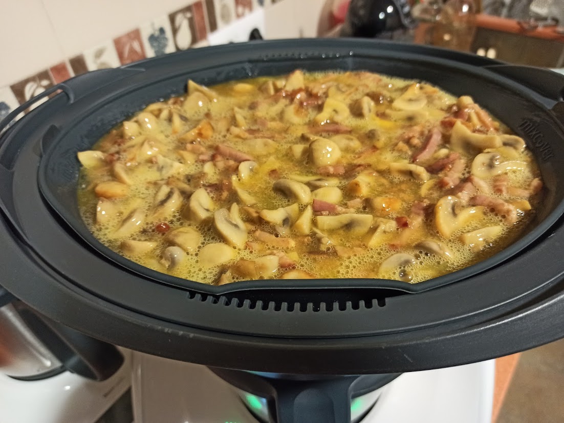 Tenía una bandeja de champiñones laminados y unas cintas de beicon que compre y estaban apunto de caducar, así que buscando por cookidoo encontré una receta super versatil: BEICON Y CHAMPIÑONES DORADOS, que pertenece a la colección Básicos para dorar, la cual la recomiendo, no tiene desperdicio de principio a fín.
