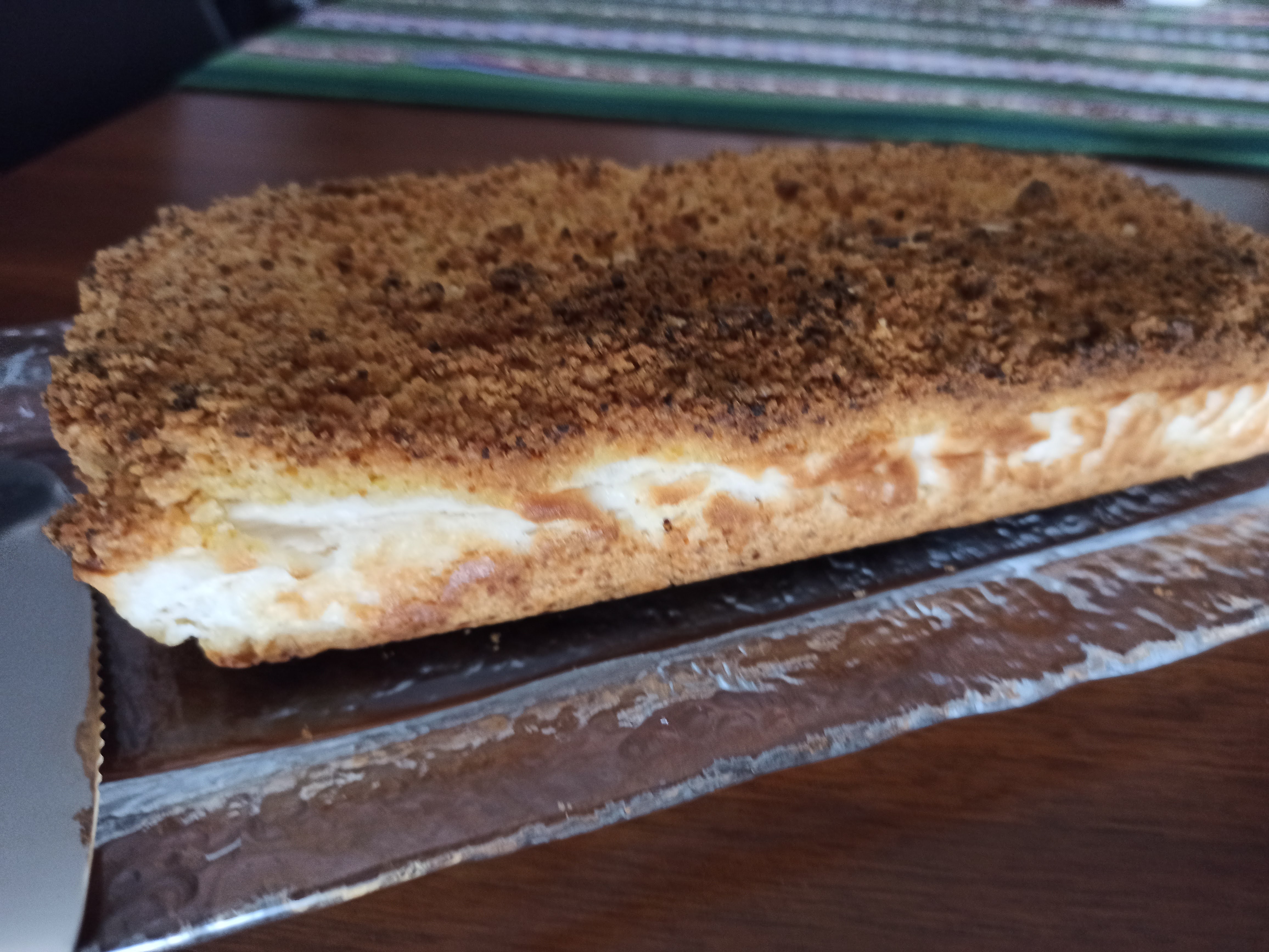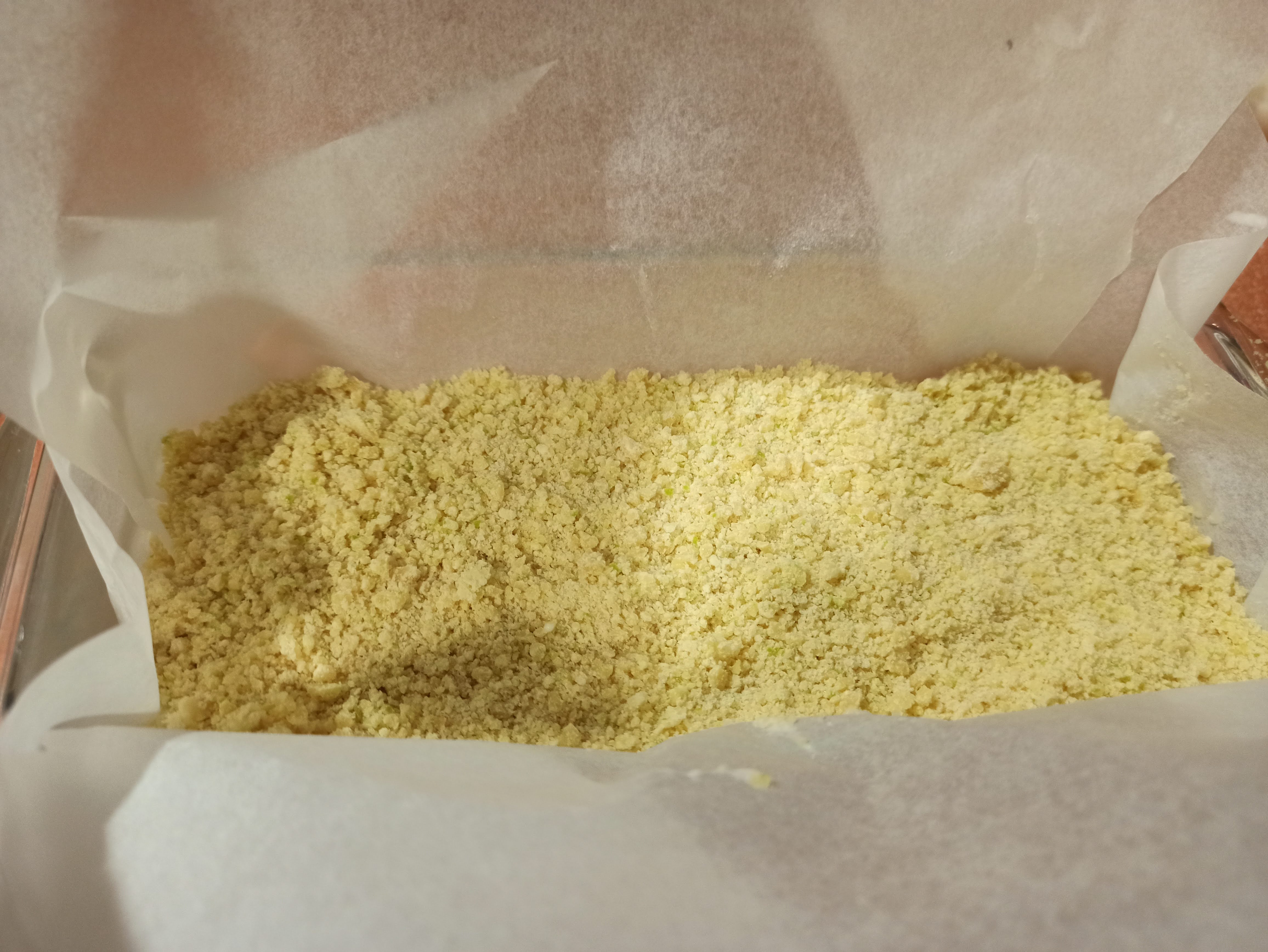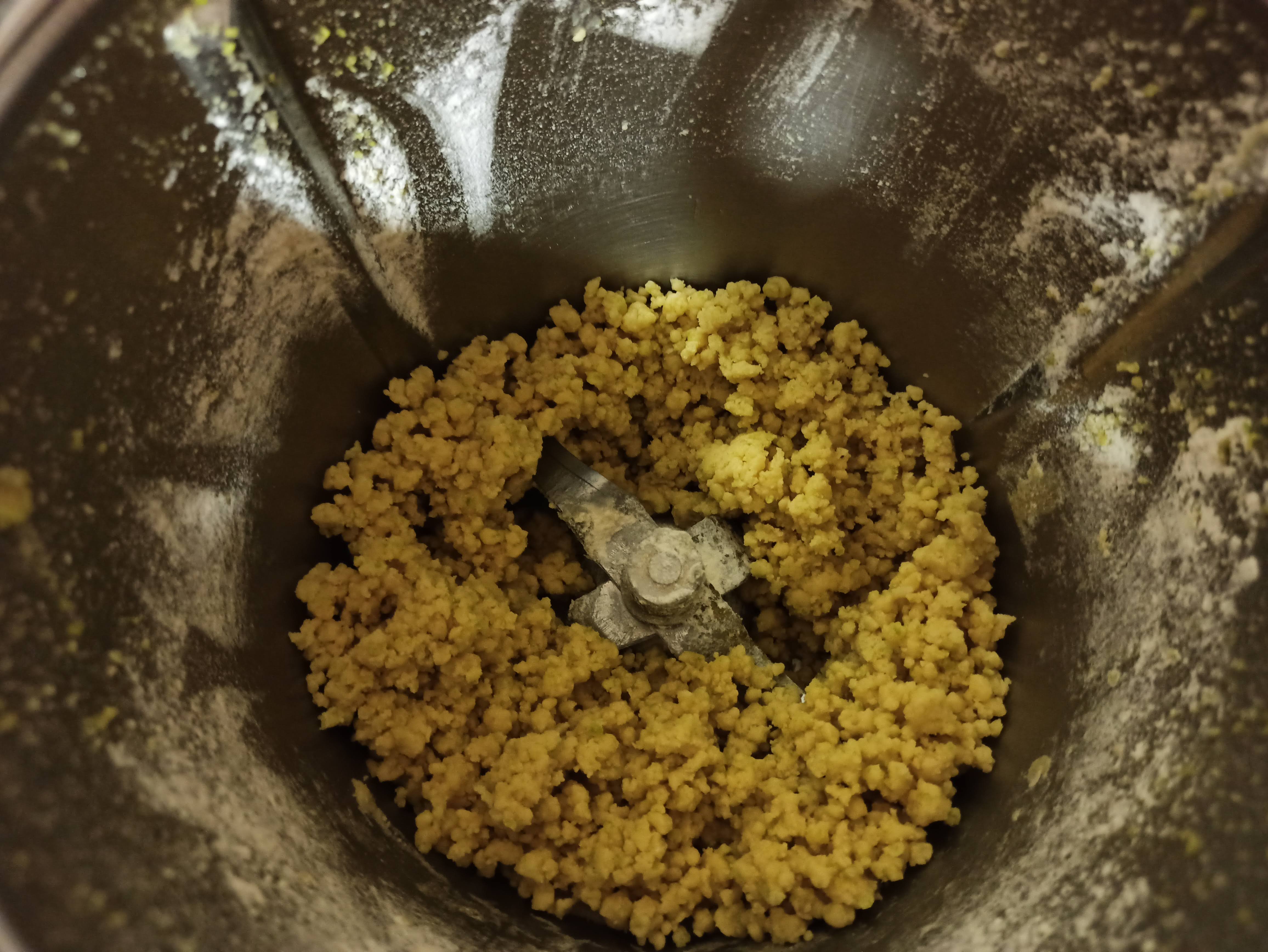 - Introducir los tres trozos congelados de masa y rayar usando la función turbo varias veces (yo la use unas 5 veces de 1 seg). Obtendremos la masa granulada y la distribuimos por encima de la crema.