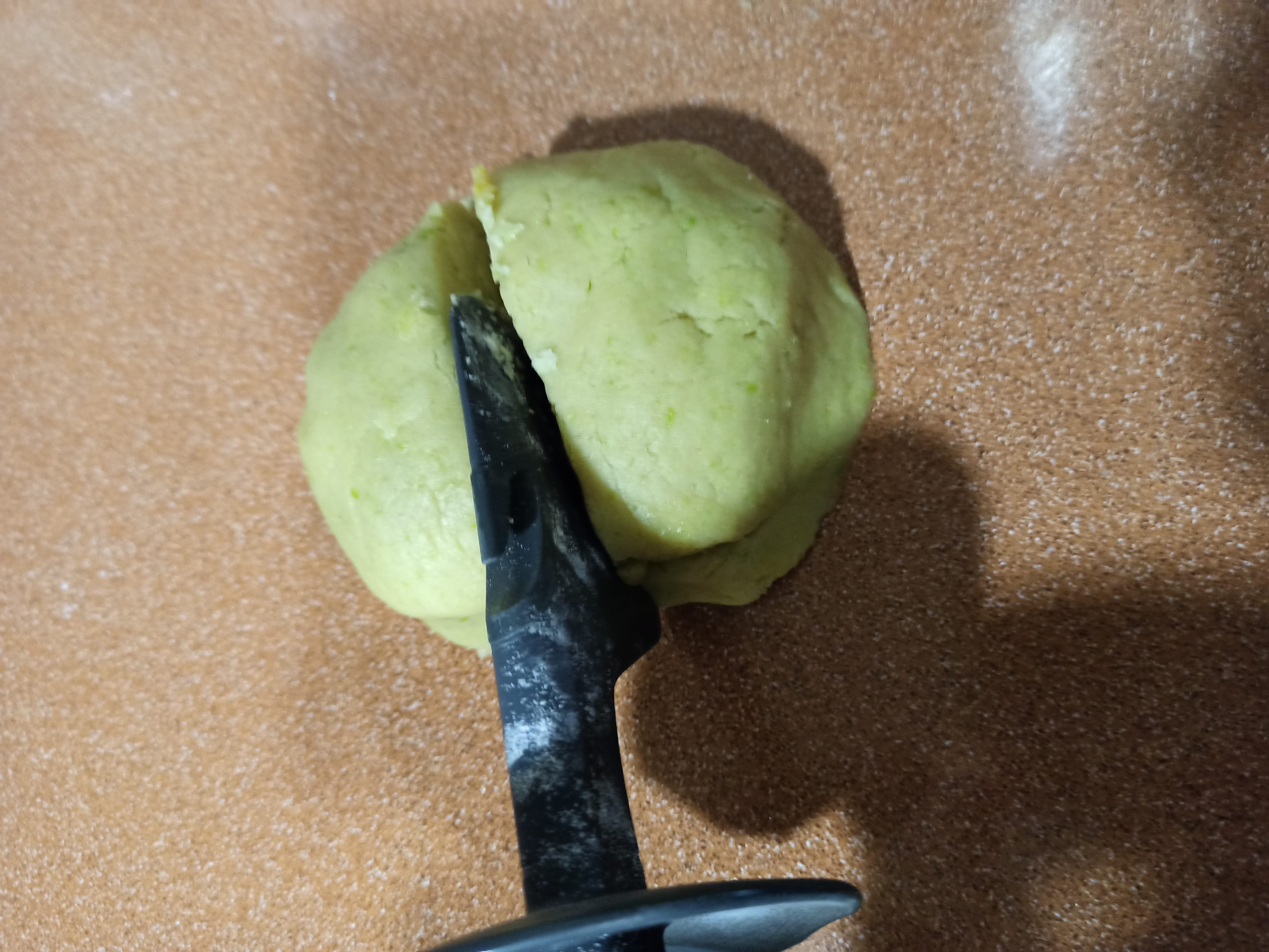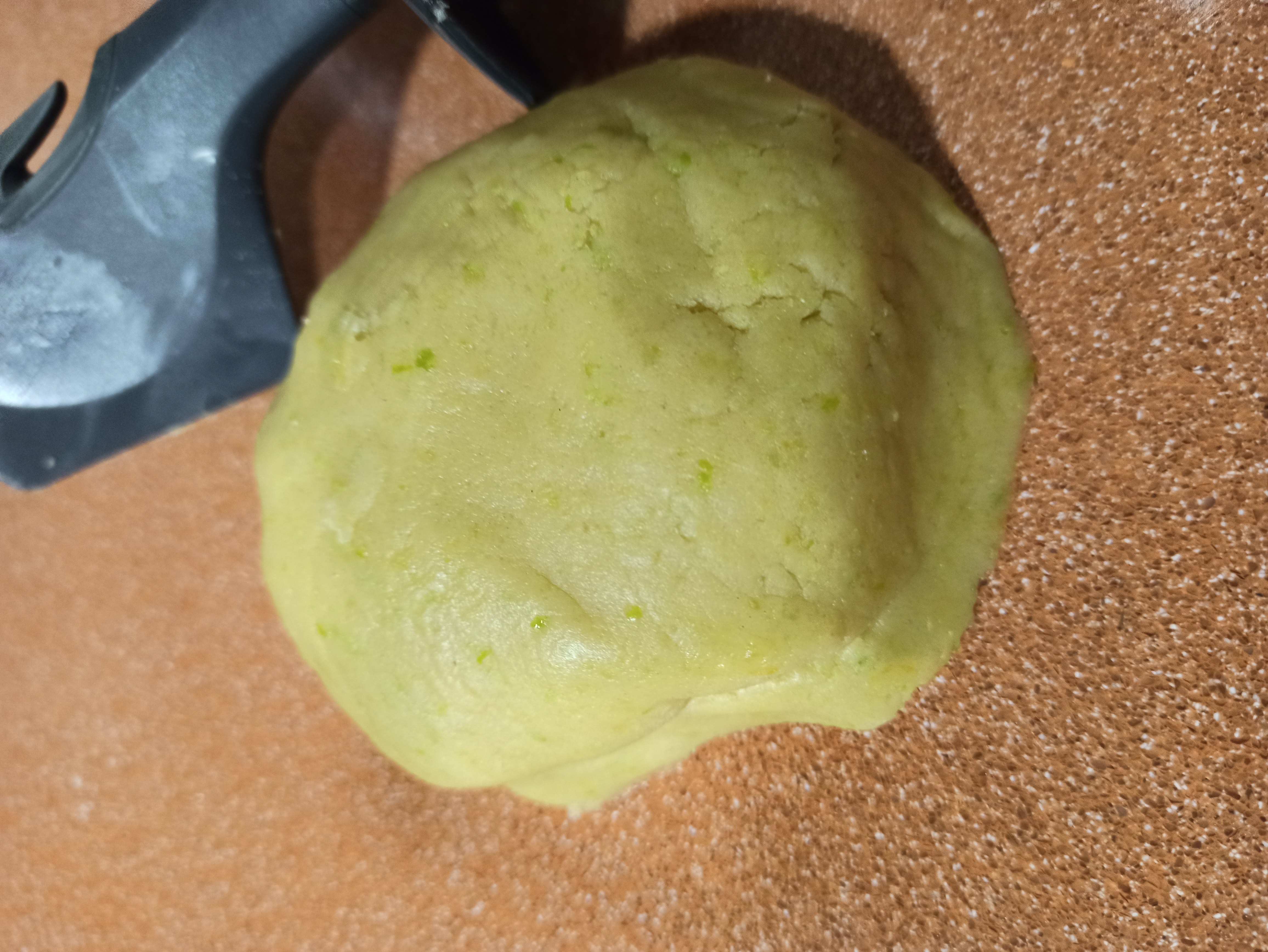 - Retirar la masa del vaso y formar una bola. Dividirla en dos partes iguales y una de las partes envolverla en film transparente y dejar reposar en frigorífico durante 30 minutos.