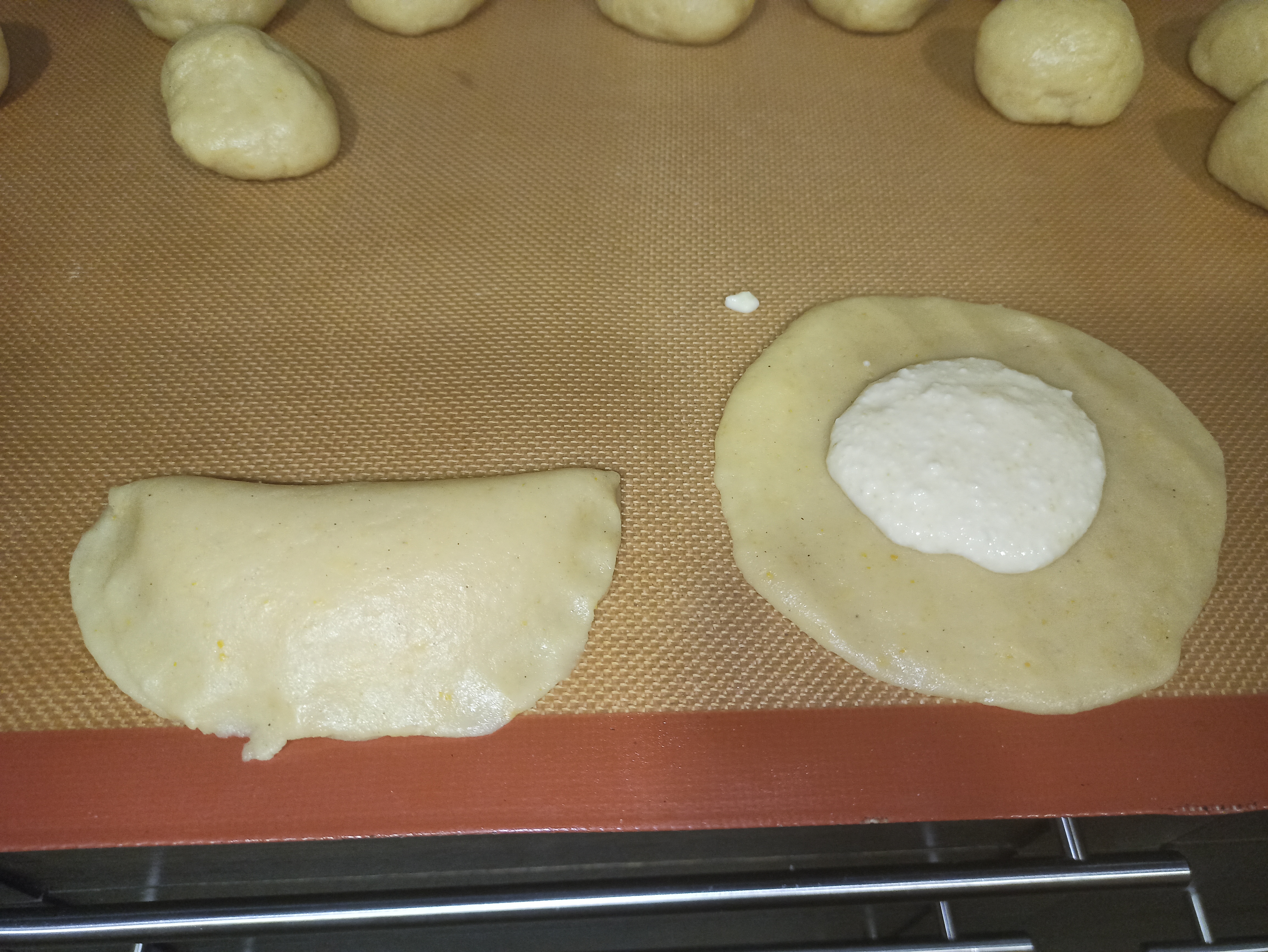- Para hacer los RUBIOLS: sacar la masa refrigerada y formar bolas de unos 40 gr. Estirar con ayuda de un rodillo y formar un círculo de unos 12 cm aproximadamente. Rellenar con una cucharada de requesón y cerrar. Con la ayuda de un tenedor presionar los bordes. Colocar los rubiols en una bandeja de horno y con el horno precalentado a 180º hornear de 25-35 minutos hasta que la masa esté dorada. Dejar enfriar y espolvorear con azúcar Glass.
