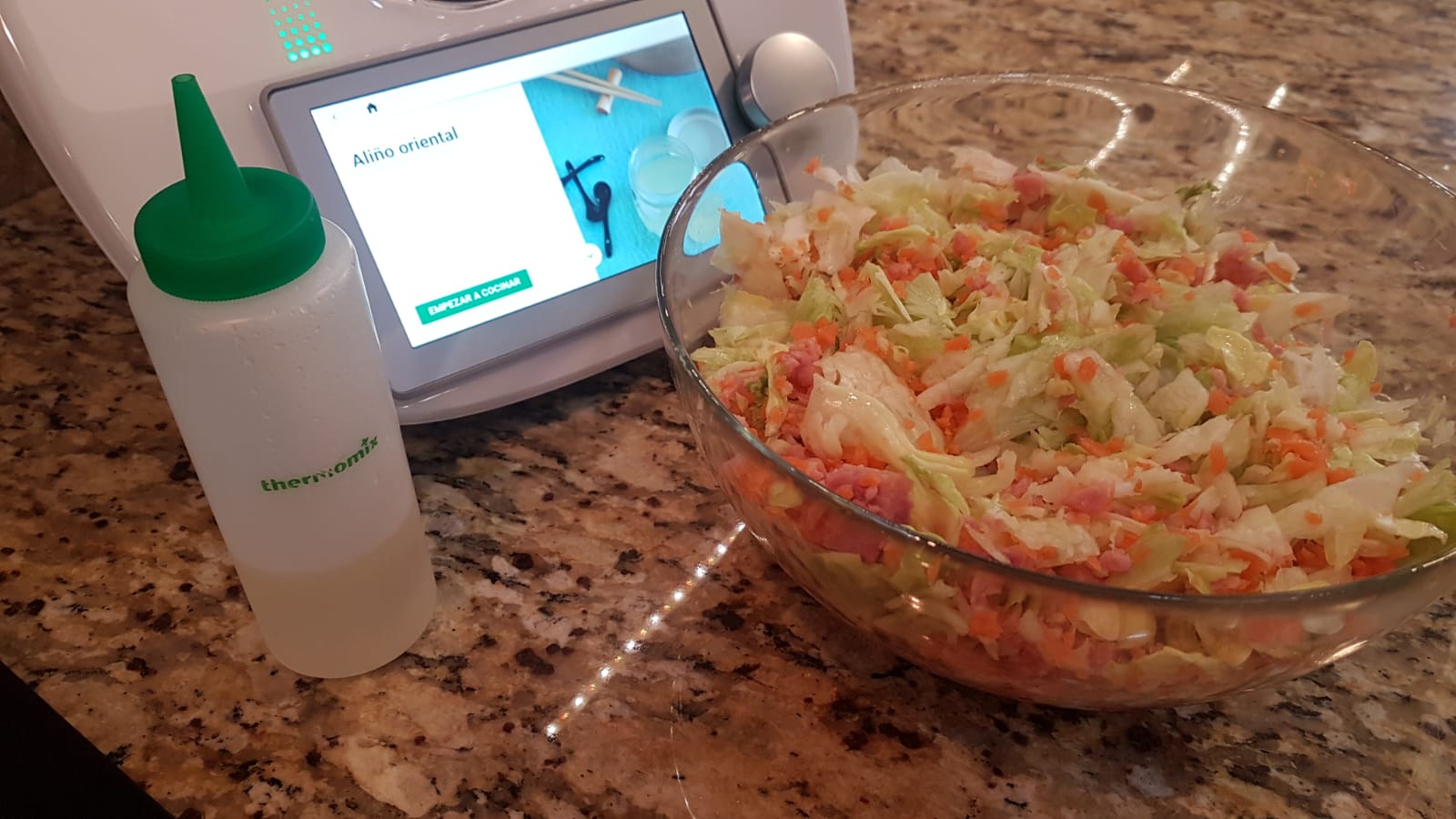 Y por otro lado tenemos una emulsión con el aliño, que haremos simplemente mezclando los ingredientes durante unos minutos en velocidad 3.5, la indicada para todo tipo de emulsiones. Os cuento:
