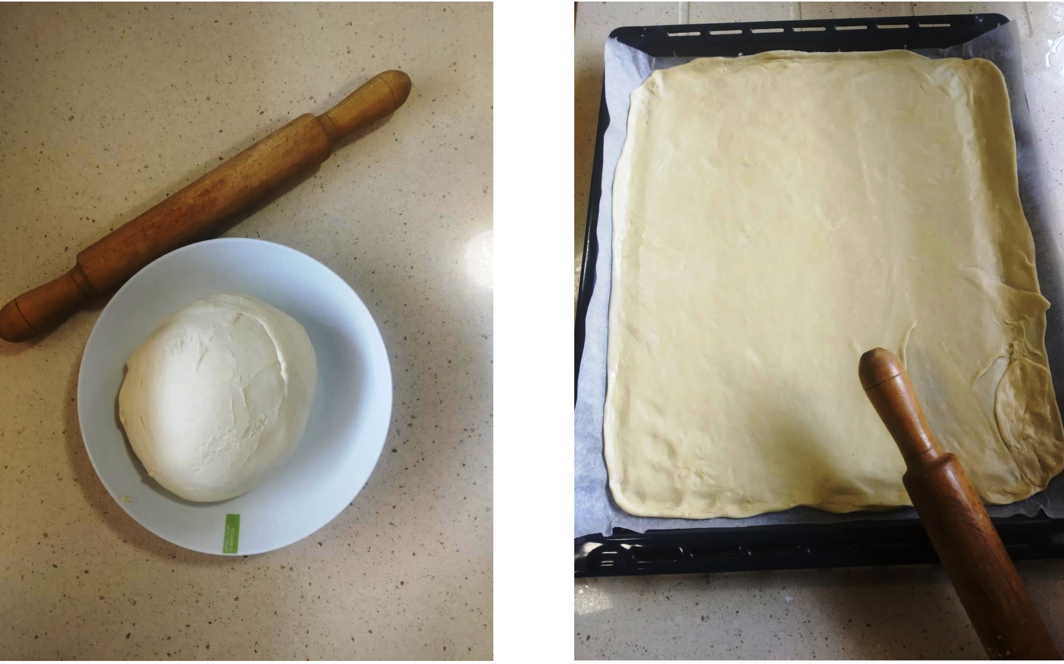 Extiende la masa sobre papel vegetal con un rodillo, luego colócala en una llanda de horno.