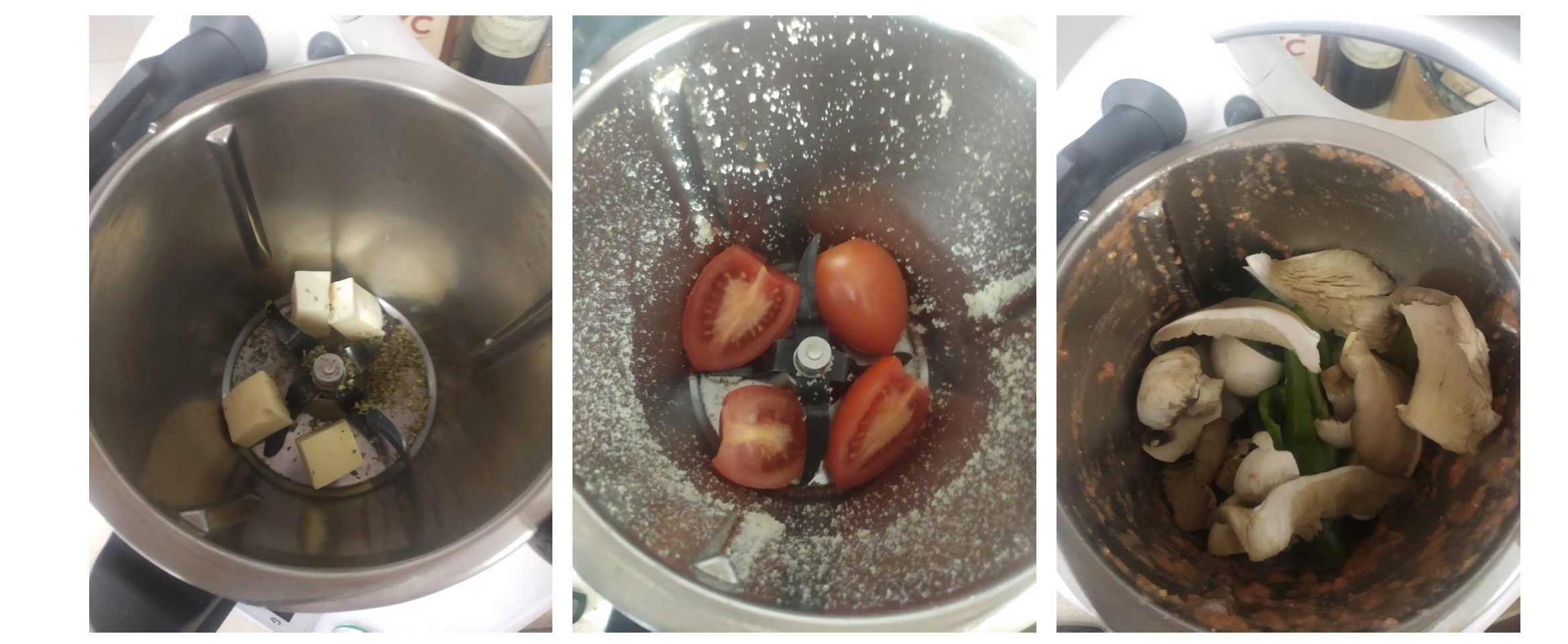 - La verdura (excepto la berenjena) la troceamos al gusto. Echa en el vaso primero los ingredientes más duros, cebolla y pimiento, después los champiñones y las setas, puedes trocear 4 seg/vel. 4.