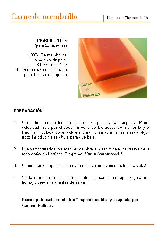 29 October 2013 El membrillo es una fruta propia del otoño que se consume tras la cocción, es una fruta carnosa de color amarillo dorado que se obtiene del membrillero. Es nativo del oeste de Asia, de la zona caucásica, y se viene cultivando desde muy antiguo. Llegó a España a través de Grecia e Italia, donde era muy estimado; de España se exportó a América.Antiguamente se pensaba que los membrillos eran un tipo de manzana. En un principio se consumían principalmente asados con miel y una buena capa de harina; ya con el descubrimiento y el mayor empleo del azúcar, empezaron a elaborarse membrillos confitados.En la Edad Media se empleaban no sólo como alimento, sino también como remedio eficaz contra la diarrea.El membrillo contiene propiedades muy beneficiosas para nuestro organismo ya que contiene pectina, taninos y ácido málico, una receta libre 100% de gluten.Carne de Membrillo es como se denomina en Murcia y por gran parte de España, pero también es conocido como Dulce de Membrillo, sobre todo en otros países como Argentina o Chile donde es un dulce muy popular.Lo llames como lo llames lo importante es que no debes dejar de preparar esta receta en tu casa con Thermomix® ! y veras lo fácil que es. ESPERO QUE OS GUSTE!!!