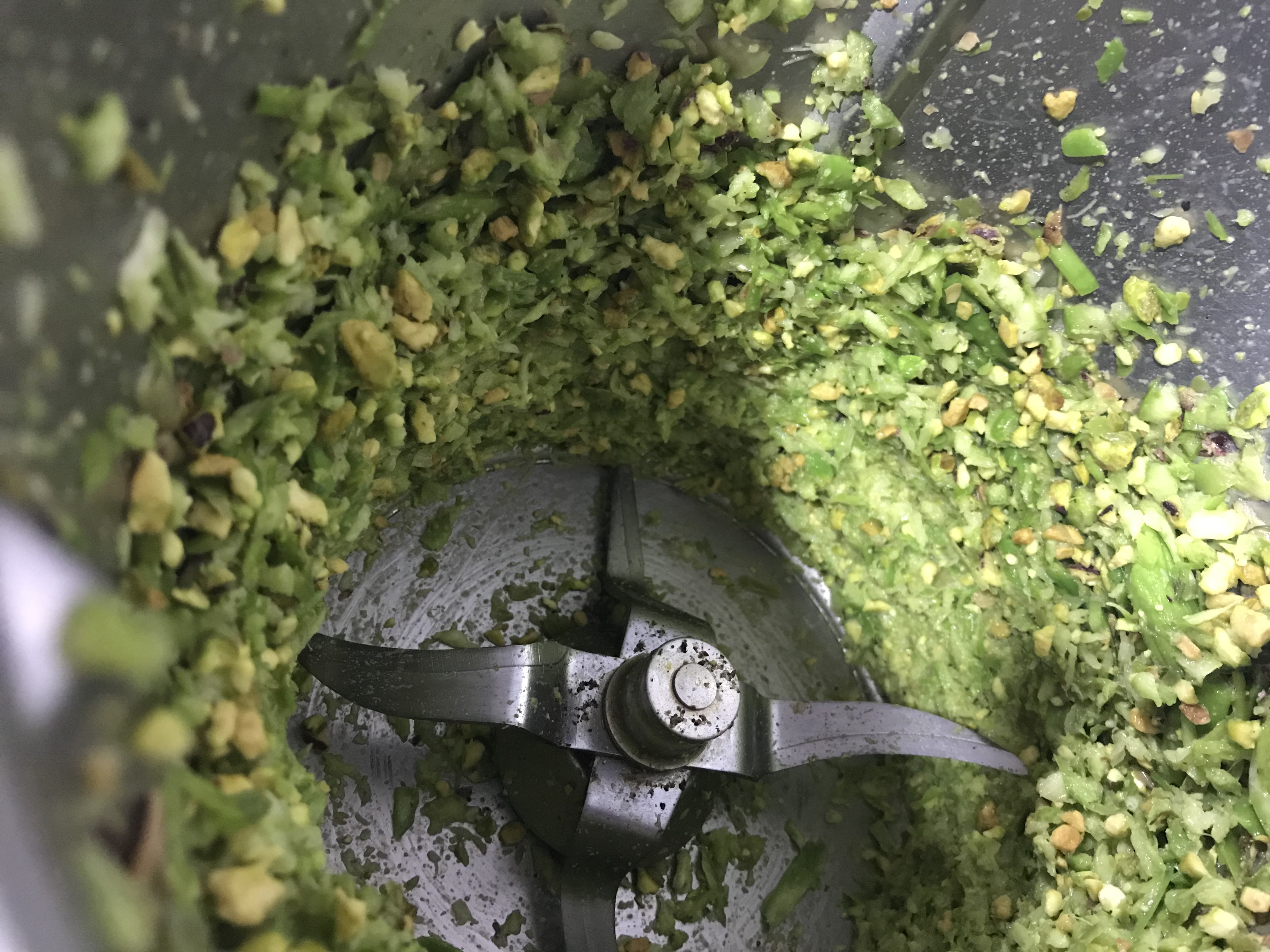 3-Escurra bien los espárragos e introdúzcalos dentro del vaso del thermomix junto con los pistachos la sal y la pimienta y trituramos 30seg/vel 5.