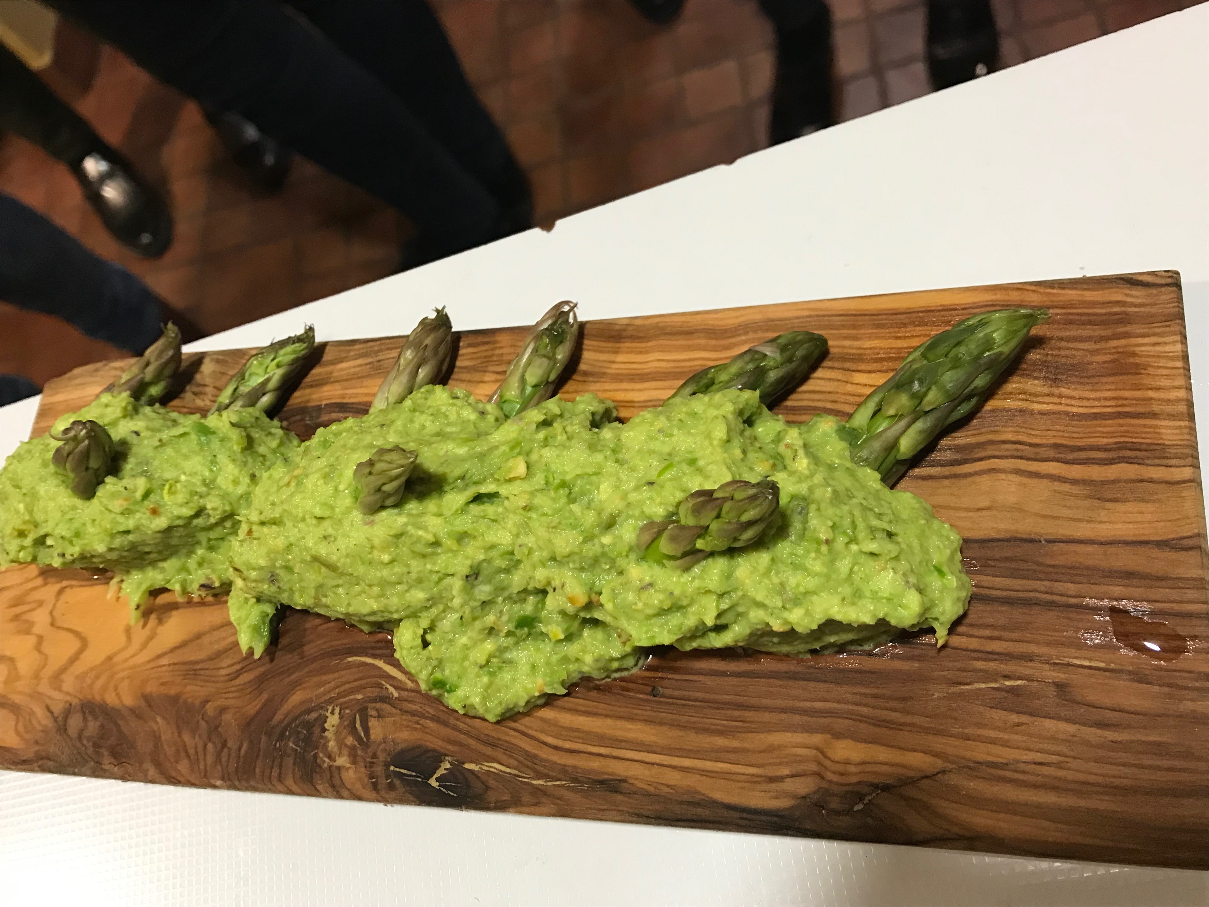 Para montar el plato ponemos la capacita ó en mini platicos o tablicas ... y en su interior introducimos la mezcla y las puntas de los espárragos. (Podemos decorar con un tomatito cherry).