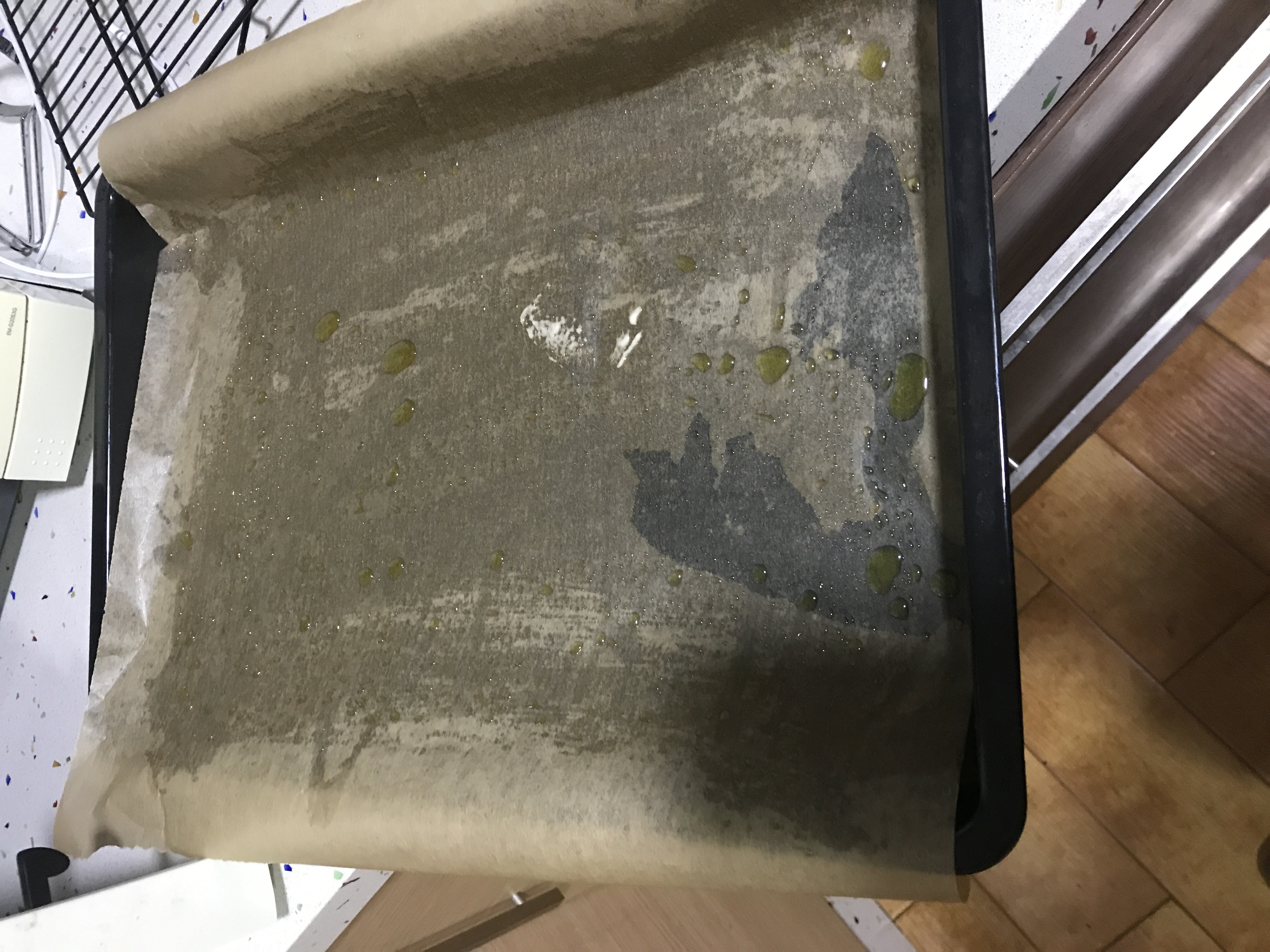 y colocamos la bandeja del horno con un papel de hornear encima, le echamos un poquito de aceite y pincelamos por todo el papel, Reservamos