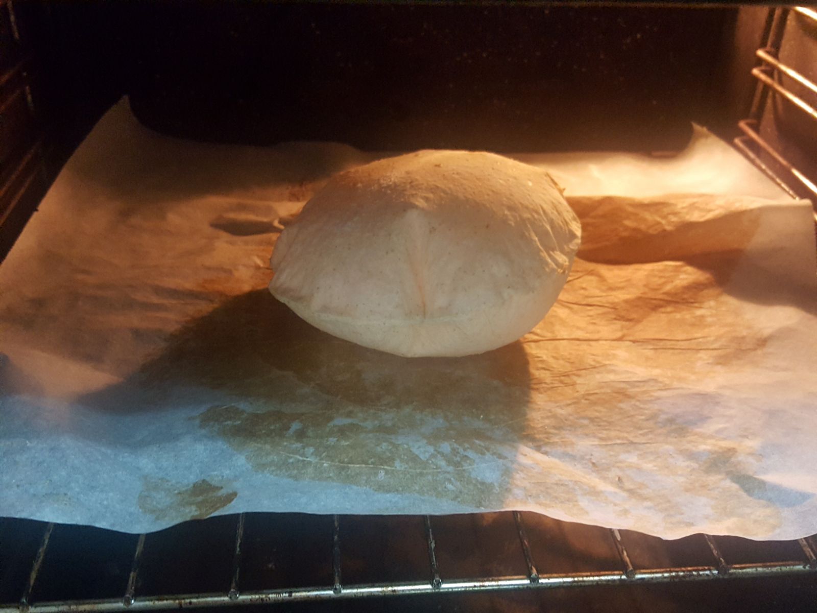 POR ENCIMA, COGEMOS LA MASA LE DAMOS VUELTA Y DEJAMOS HORNEAR POR EL OTRO LADO ... así, tal y como veís en la siguiente foto: