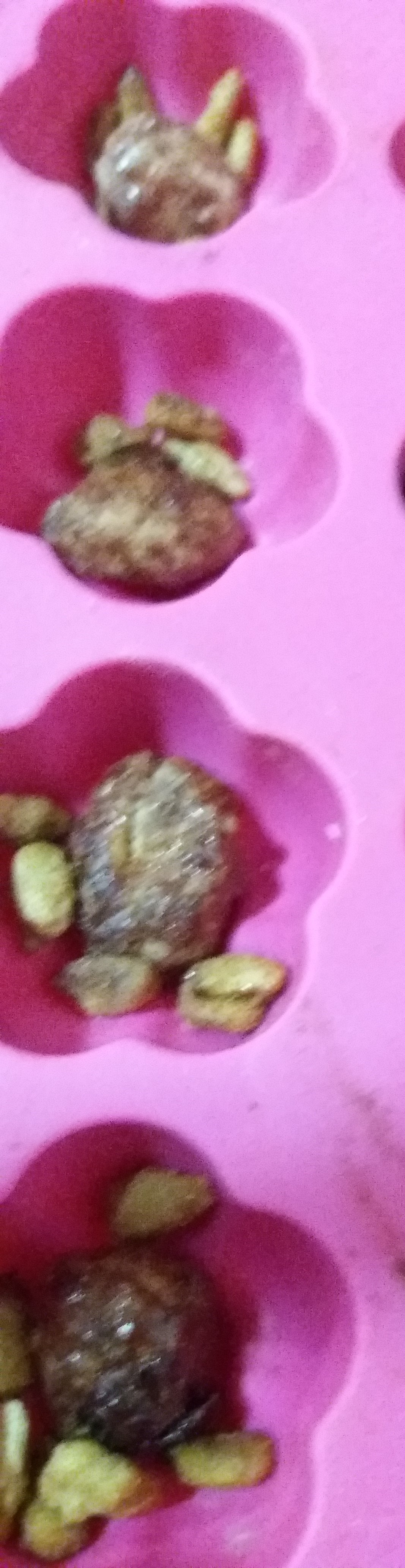 2. Seguidamente, programamos 5 min/50º/ vel 2., mientras tanto en cubiteras vamos poniendo el fruto seco que hallamos elegido para hacer el bombon, tal y como os enseño en la siguiente foto