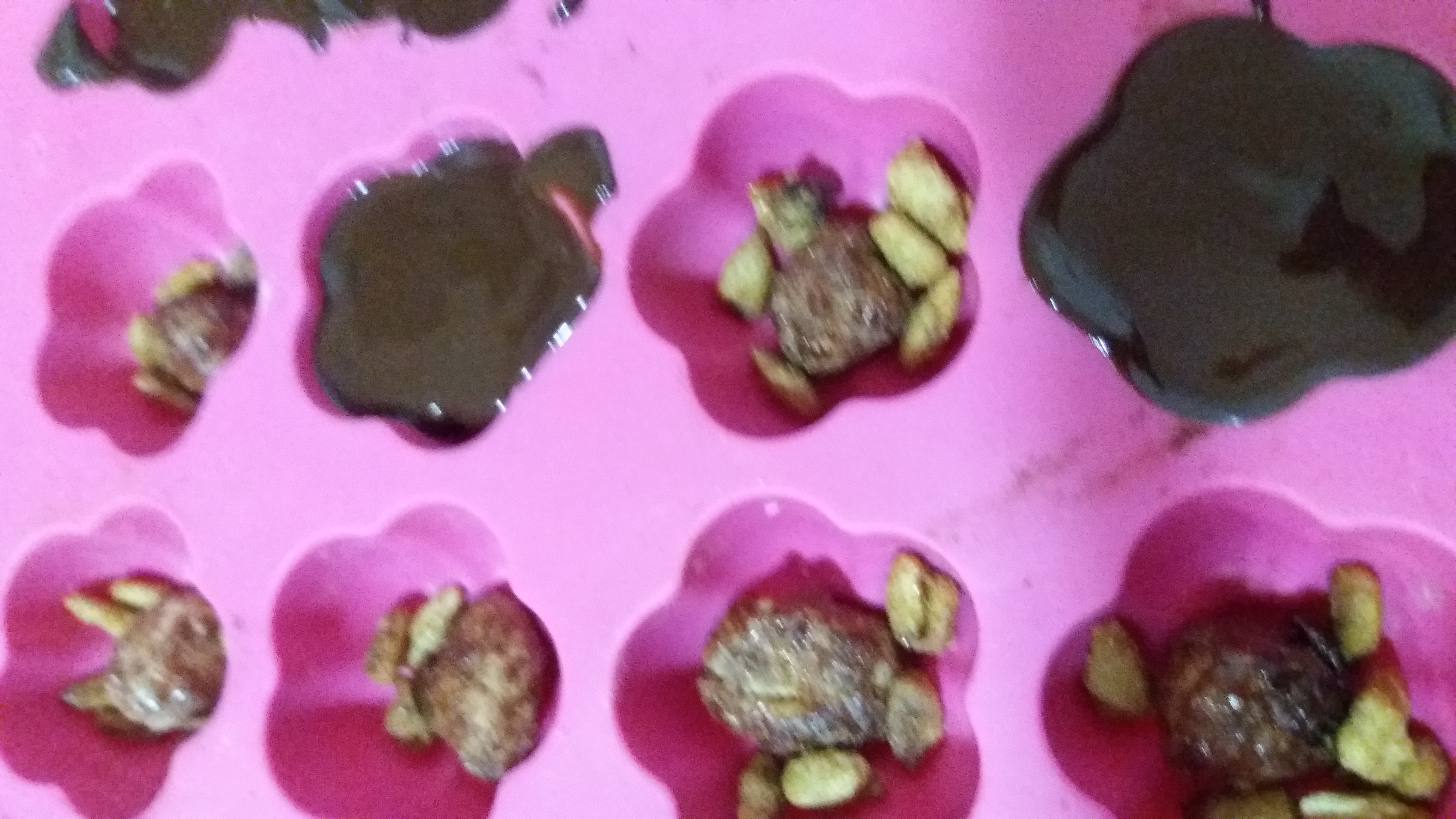 yo pongo tambien el chocolate fundido en la cubitera , luego echo la almendra, pipa,... y doy vueltas con un palillo, también así quedan ideales... son especiales.