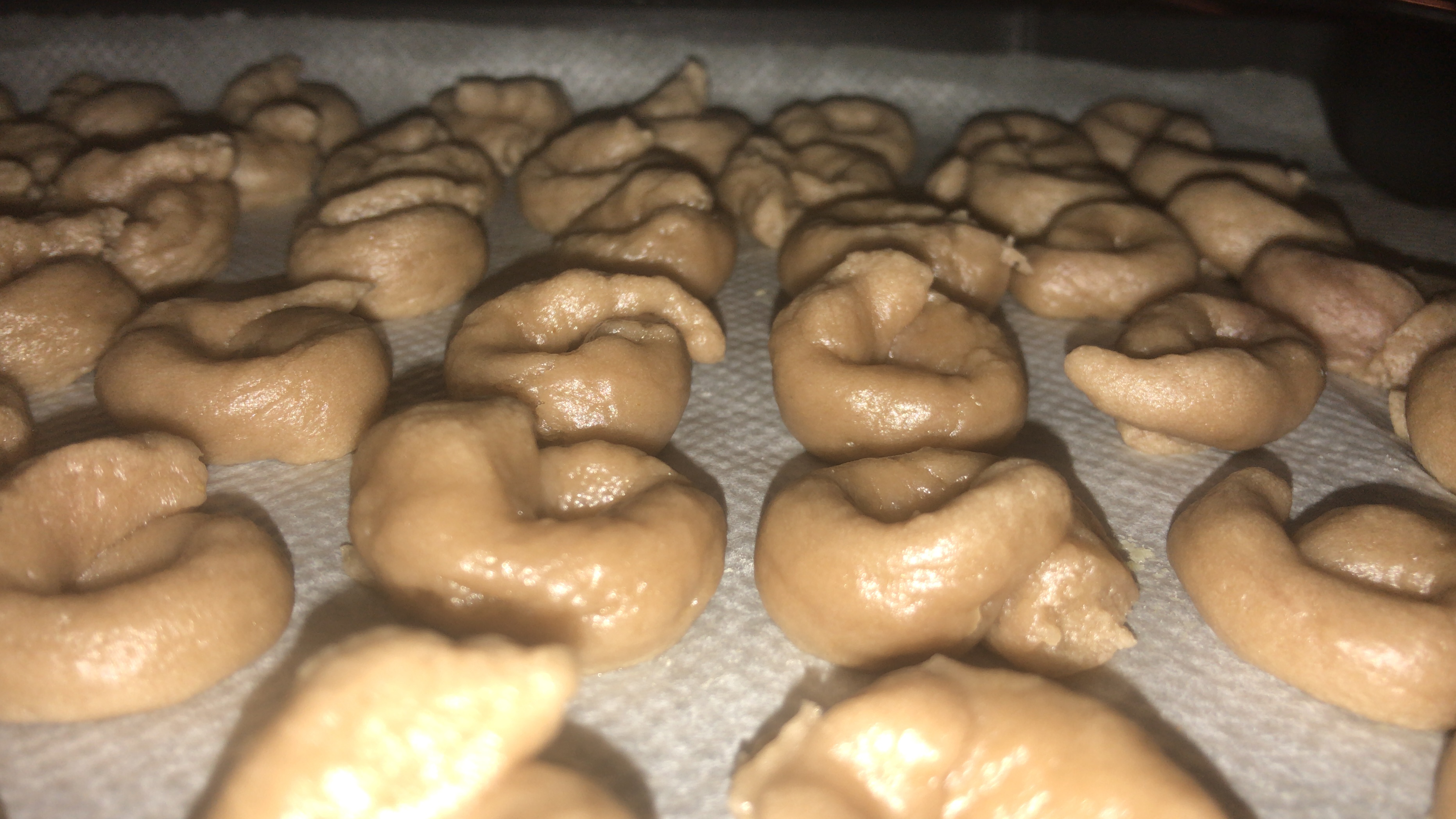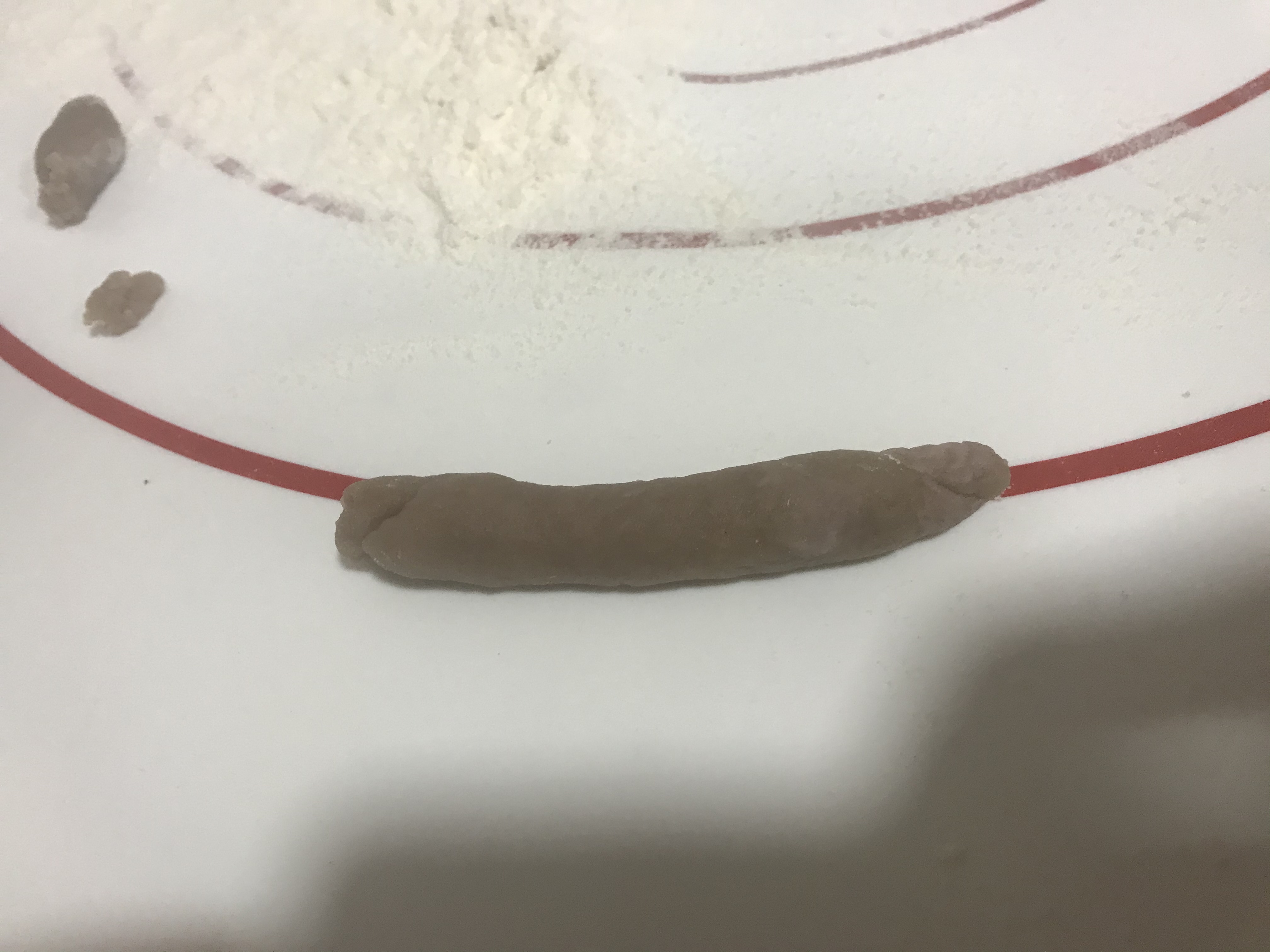 Sacamos del vaso la masa, y empezamos a coger masa como unos 2ogramos , formamos una especie de culebrilla redonda y unimos los extremos- es una masa súper manejable-