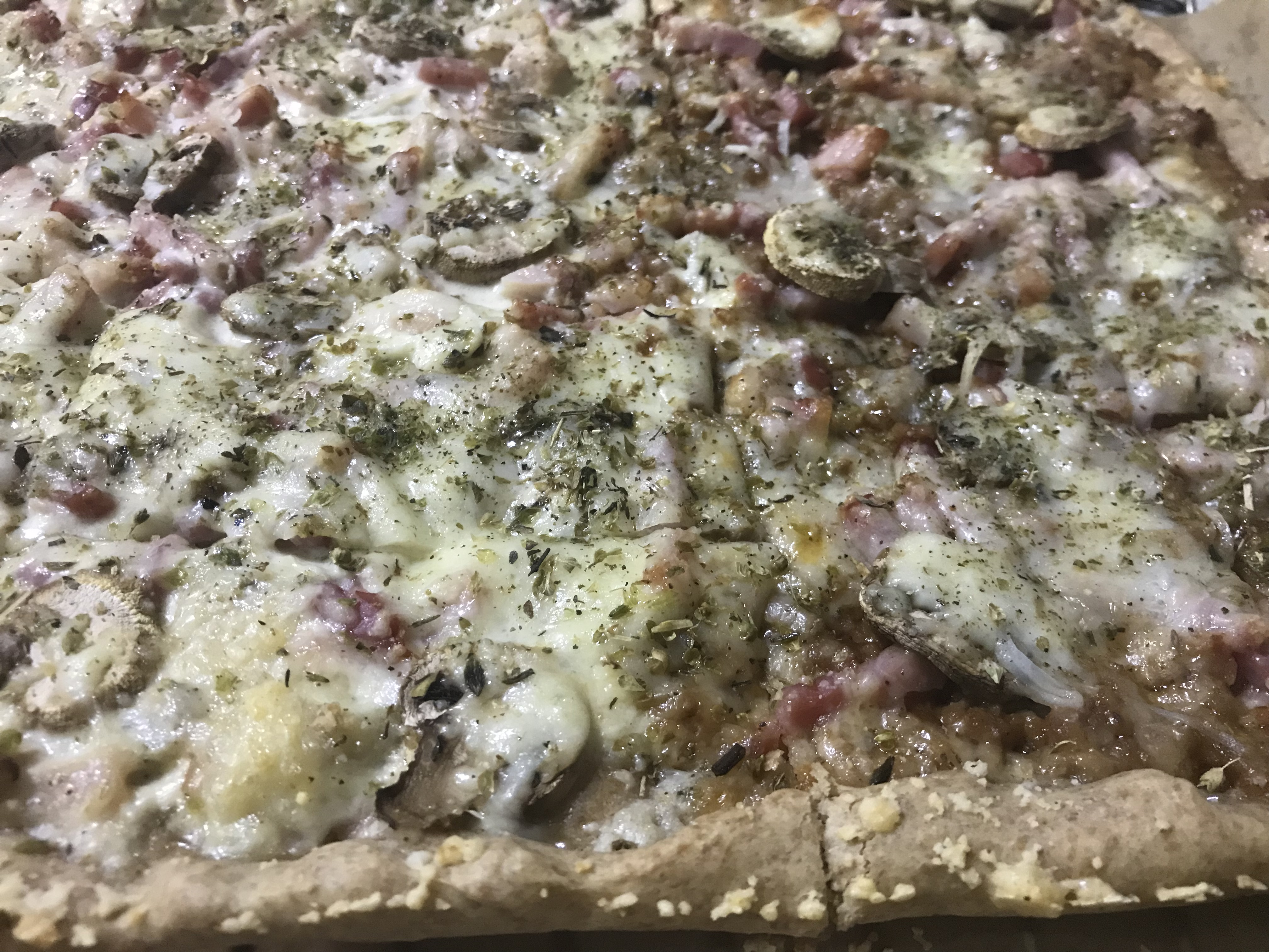 Y nos disponemos a echar encima de nuestra masa con los ingredientes que has preparado, esta vez he hecho una parte de carbonara y la otra barbacoa... echamos encima queso rallado, y orégano.. y al horno unos 15 min a 20 minutos