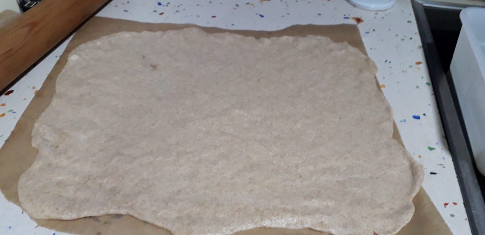 Con ayuda de un rodillo, extendemos ... con esta cantidad te sale una bandeja de horno para una base, tal y como vemos la siguiente foto