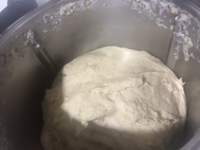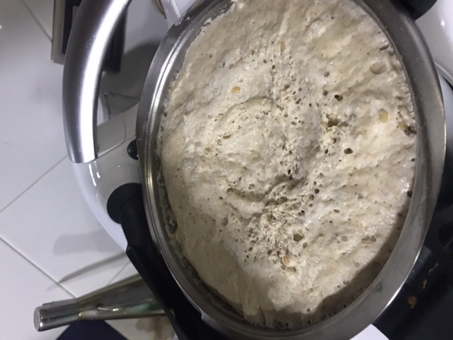 Incorporo el resto de ingredientes y mezclo 30seg/ vel 6 y seguidamente quito el cubilete y programo 6minutos velocidad amasar( Tm5 o tmx6) o 6 minutos vaso cerrado vel espiga(Tm31)