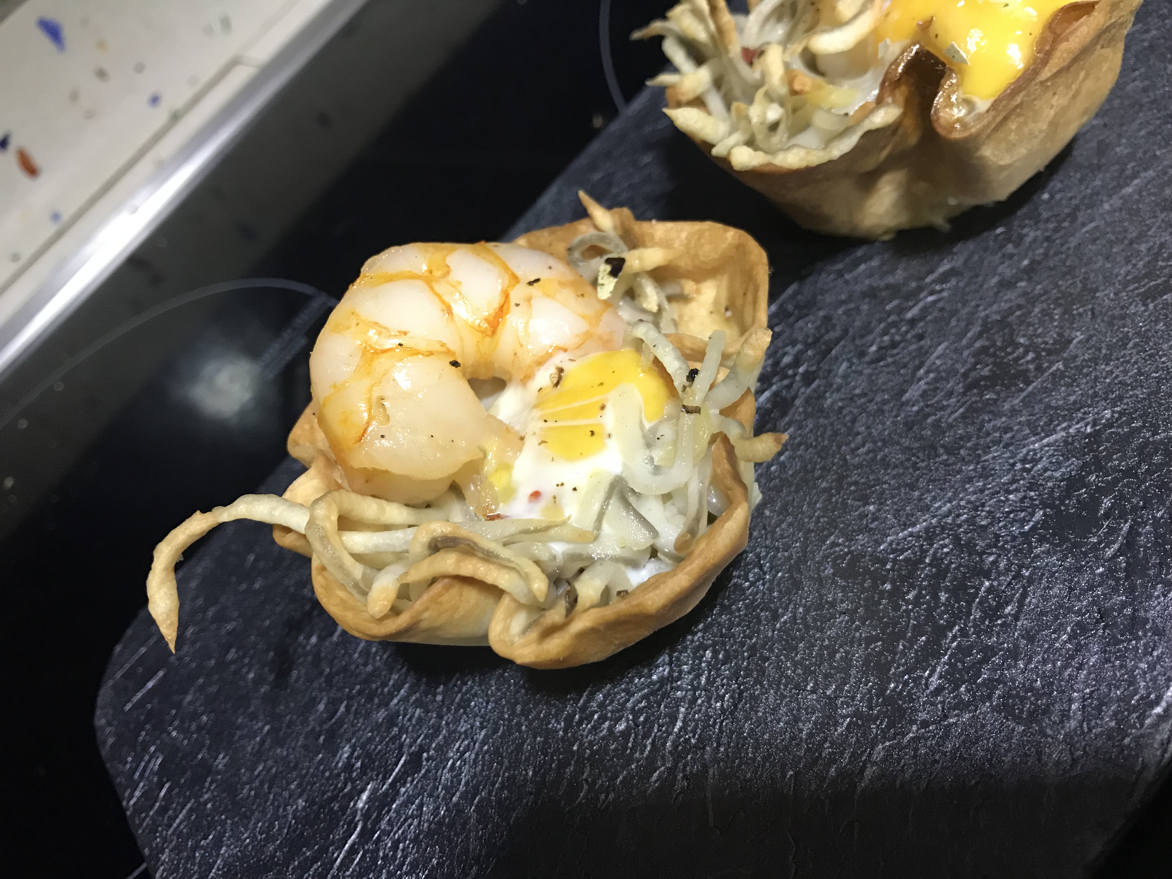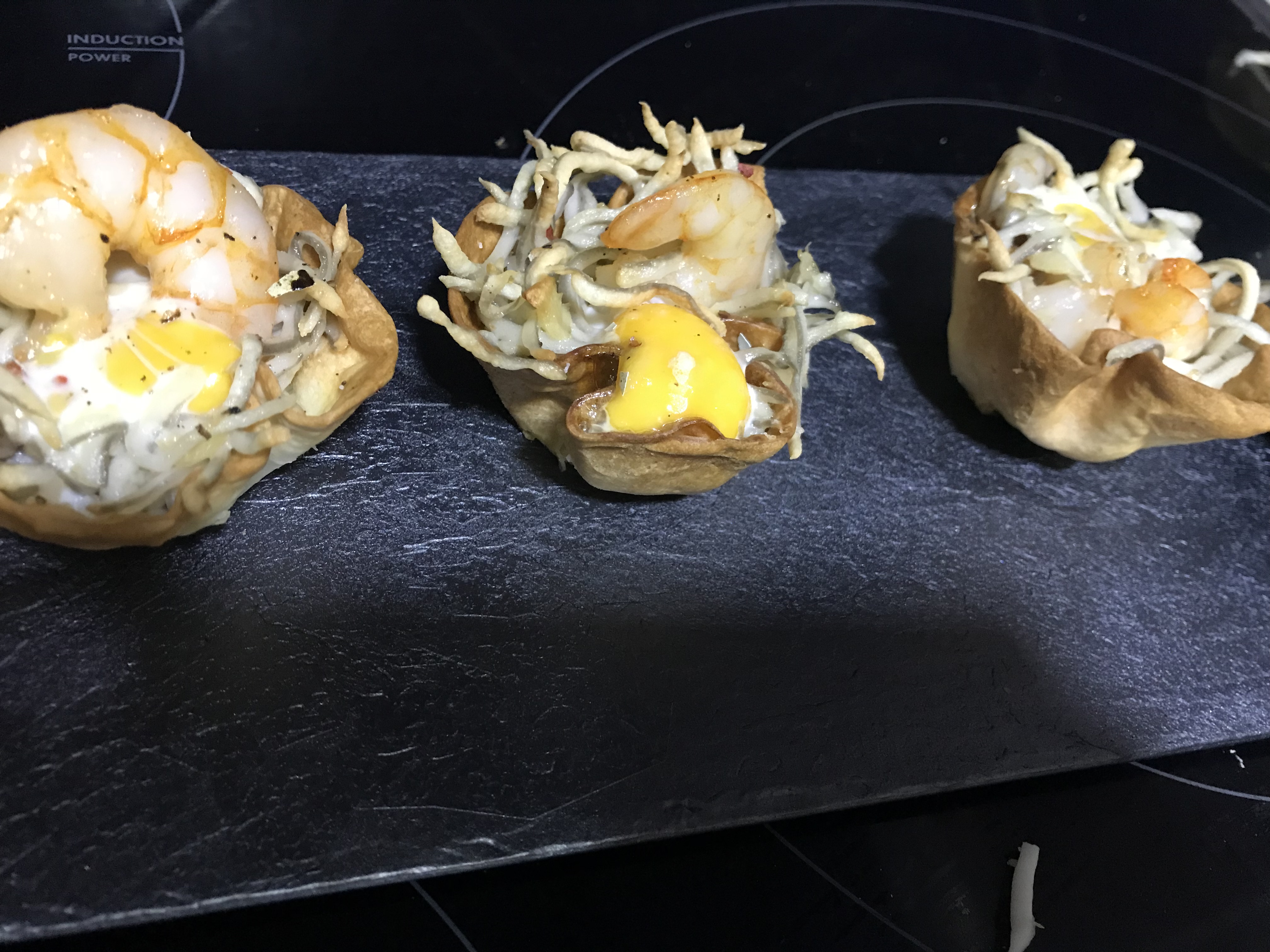 metemos horno 6 minutos. Sacamos del horno, que seguro que nuestro relleno ha terminado vamos llenando las casitas con el relleno y cascamos el huevecito de codorniz encima y echamos un pelin de sal y de pimienta.