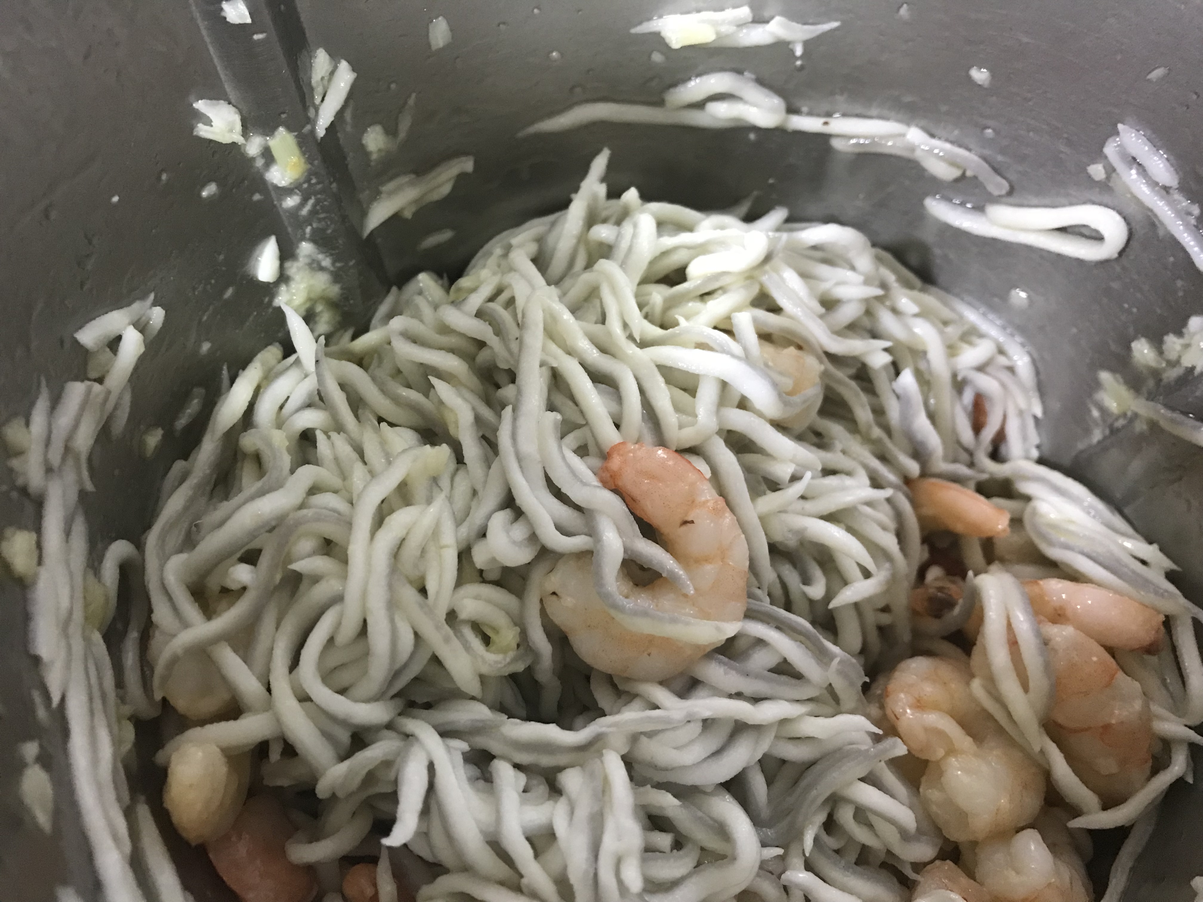 3.Por último,incorporamos las gulas,las gambas,la pimienta y la sal y programamos 6 min/ 120•/giro inverso/vel cuchara o 8 min/Carola/giro izquierda vel cuchara .