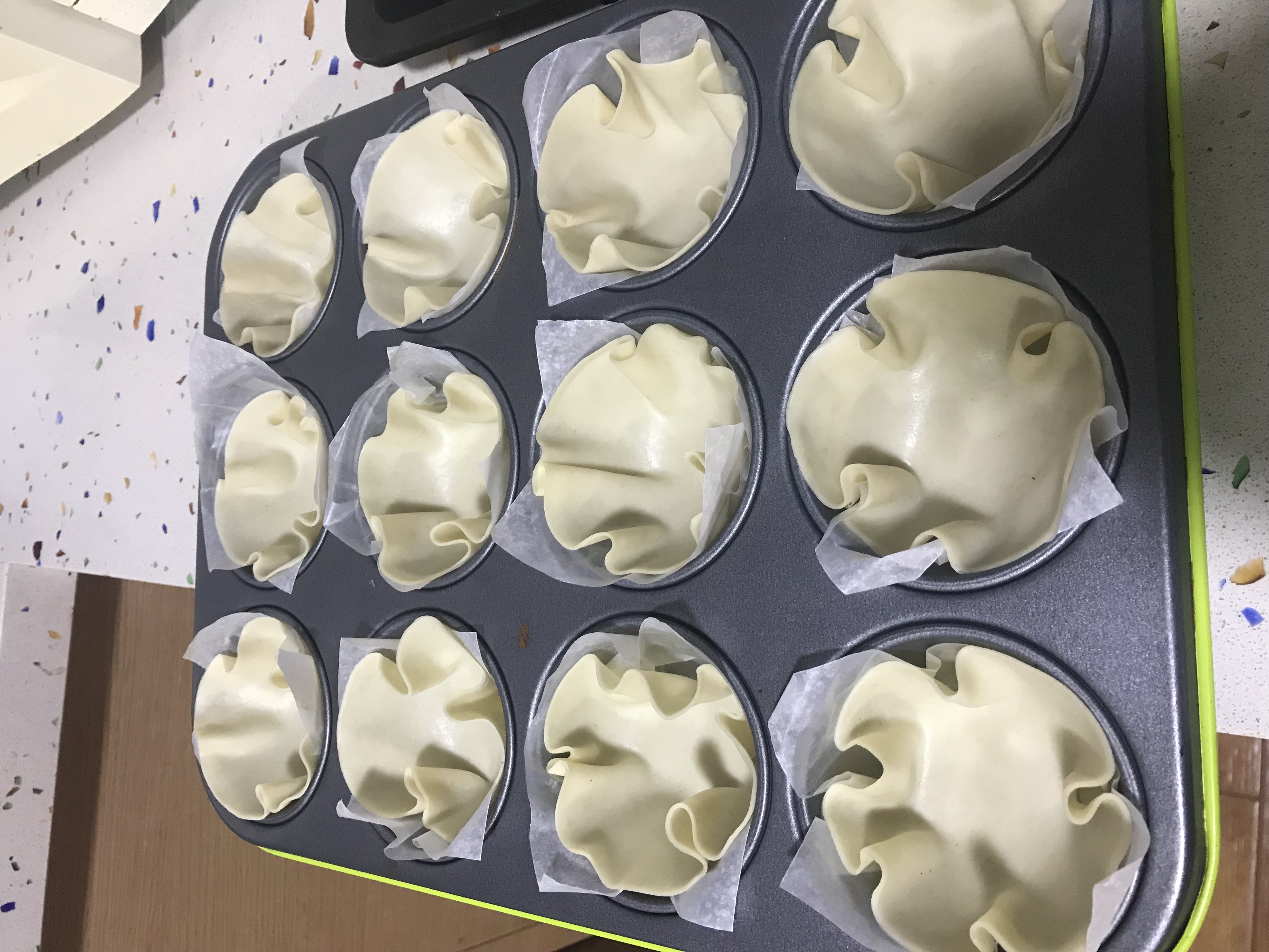 Mientras tanto , en un molde de hacer magdalenas o flaneritas de aluminio colocamos la masita de empanada dándole formita de cestita