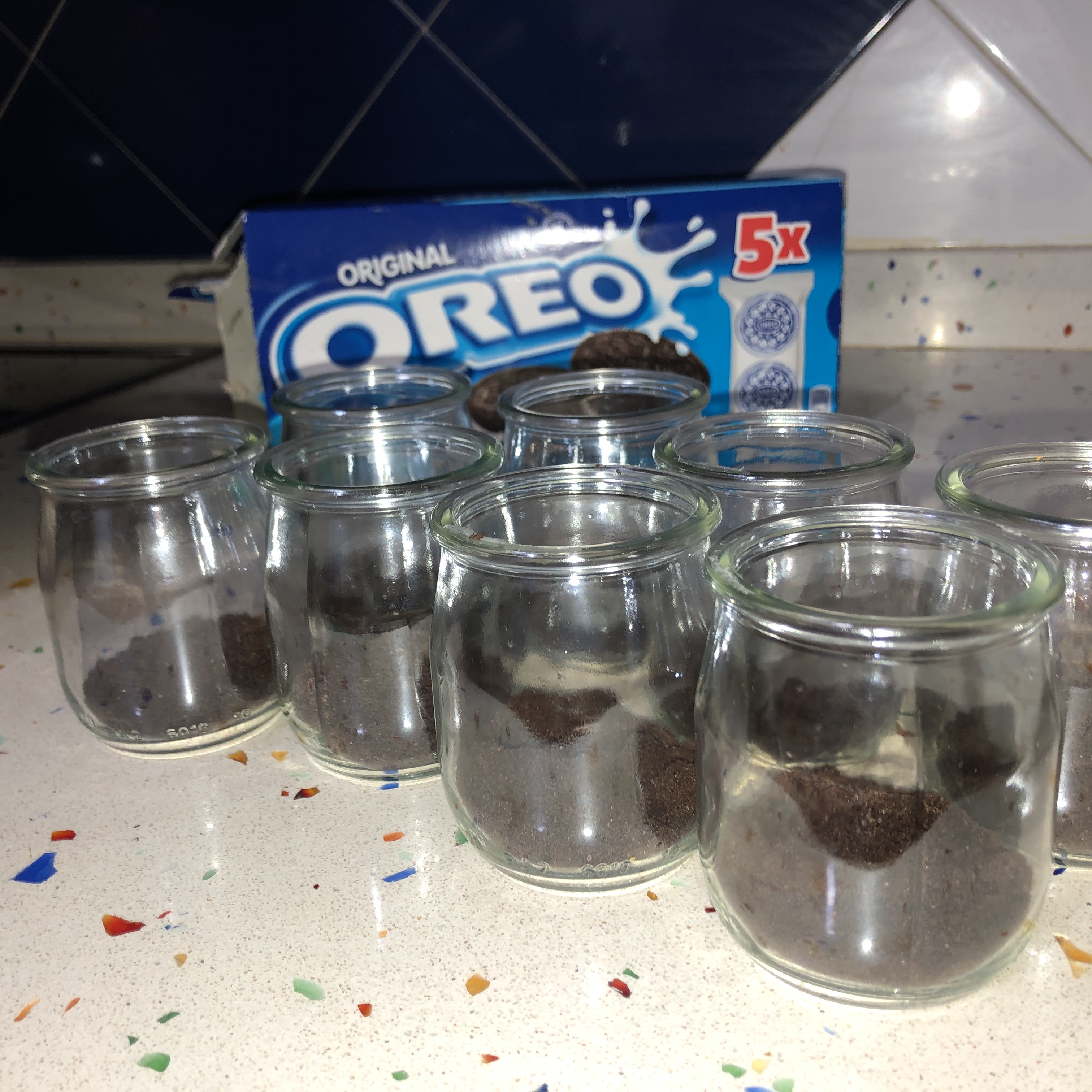 Mientras el chocolate se está derritiendo.. lo que vamos ha hacer es preparar los vasitos e ir echando en cada uno de ellos un par de cucharadas sopera de galleta oreo triturada... tal cual veís en la siguiente foto..