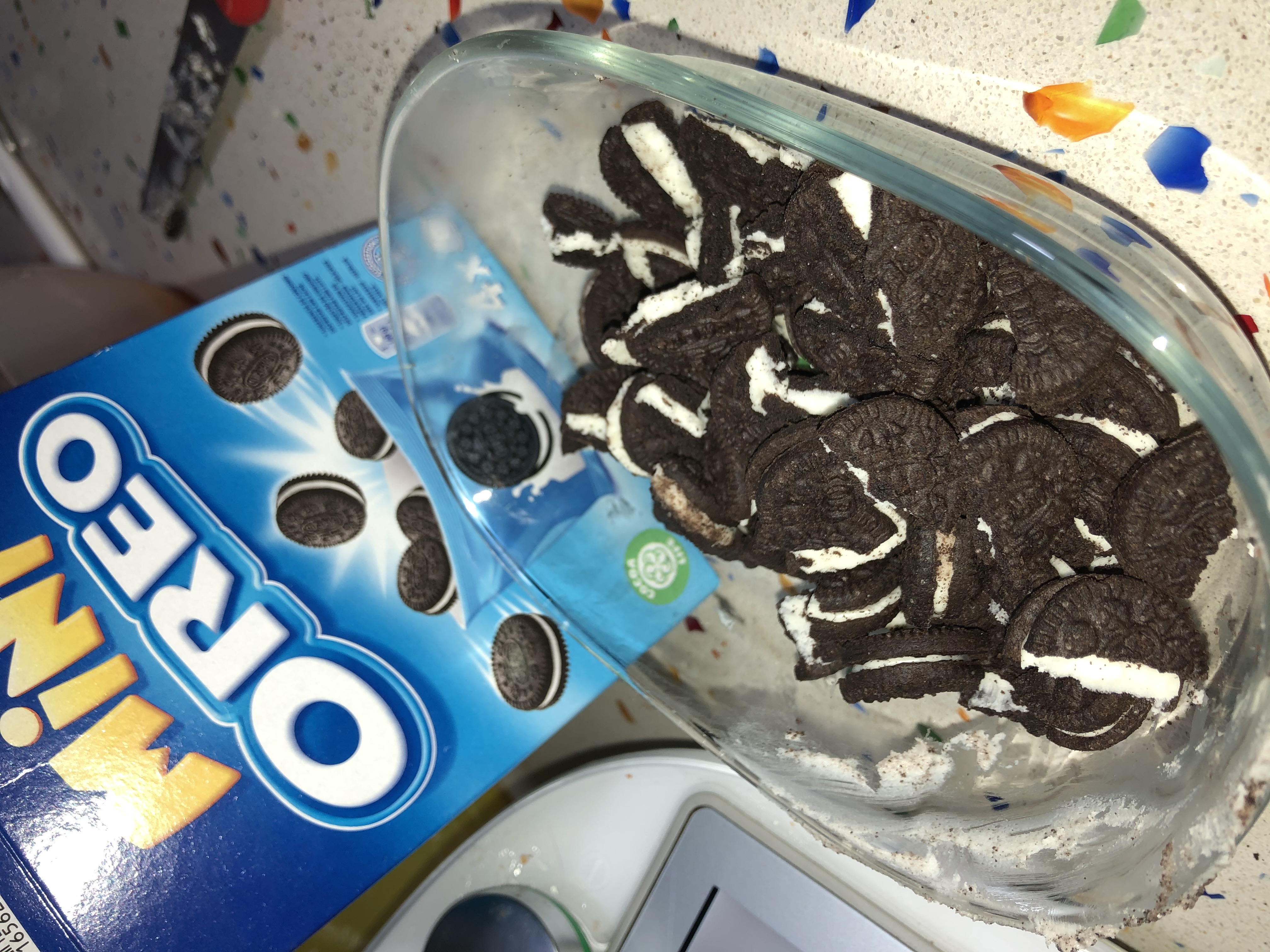 -80 gr de galletas mini oreo, partidas en mitades ( si quieres tener un poco más para la decoración mejor)