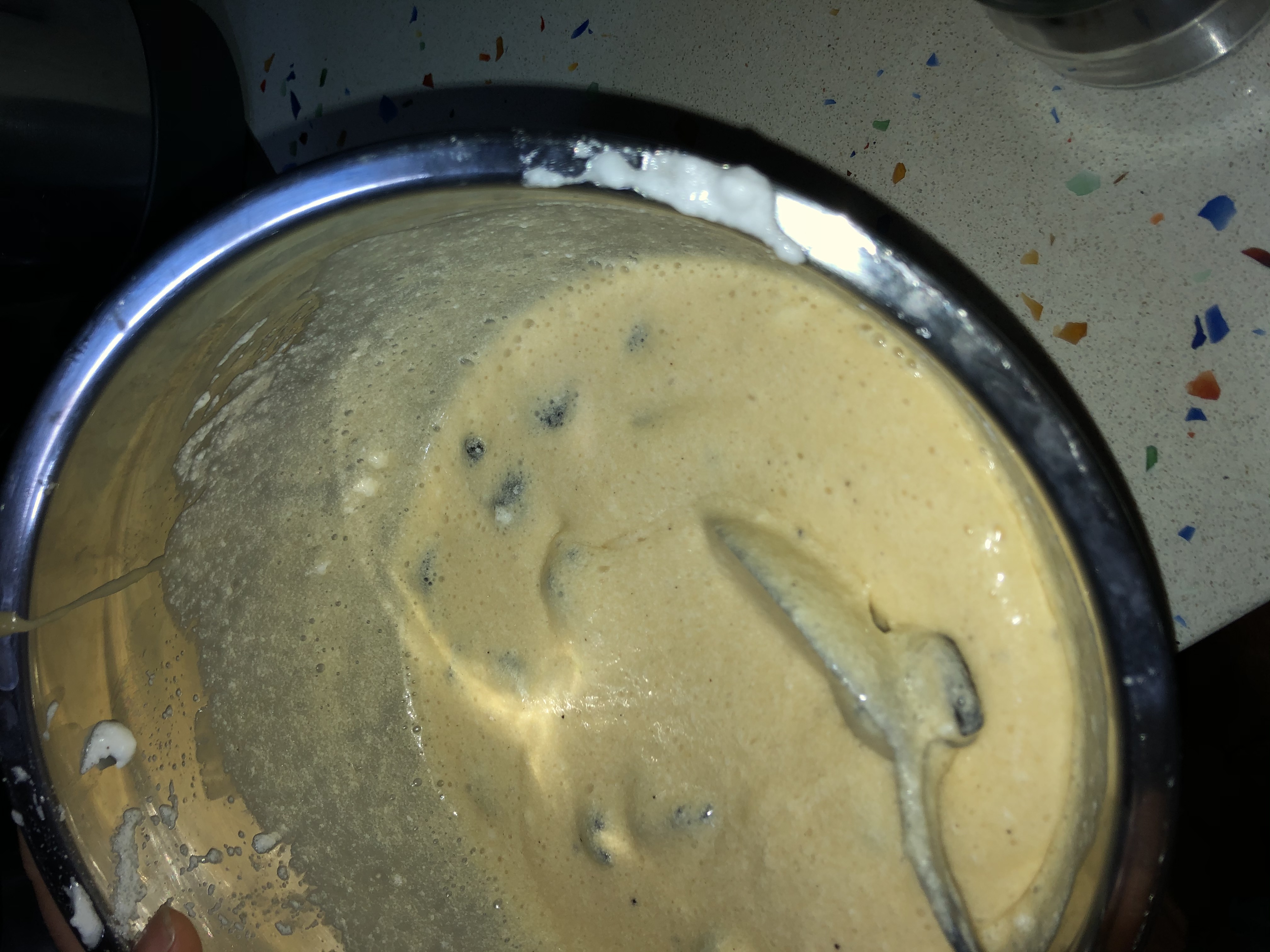 5-Añadimos al chocolate derretido, la crema de galleta oreo que teniamos reservada, las yemas y mezclamos 15seg/ vel.4.