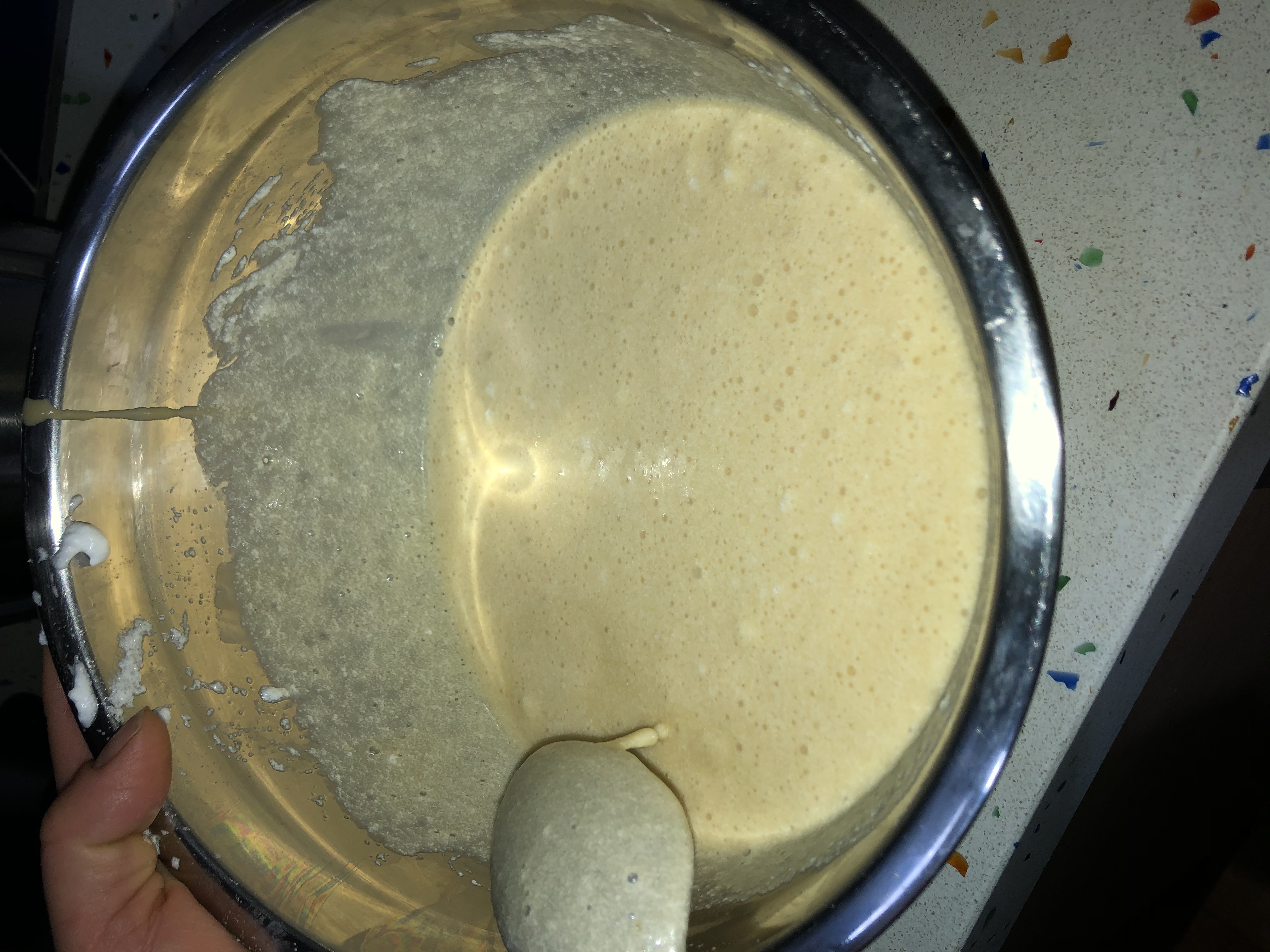 Terminado el tiempo, sacamos del frigorífico, el merengue anterior, y a este vamos echando muy poco a poco la mezcla y con ayuda de un tenedor o mezclador,