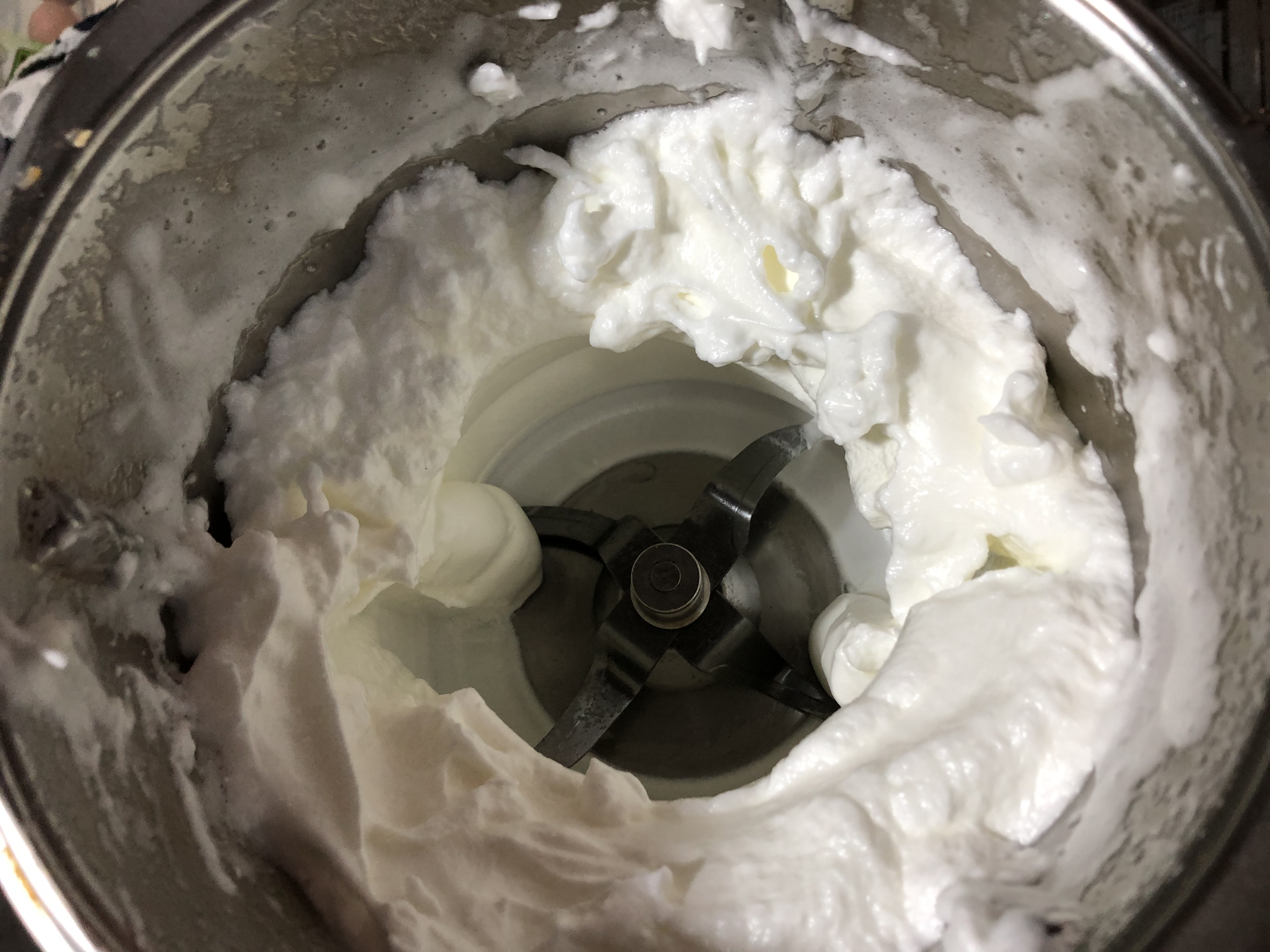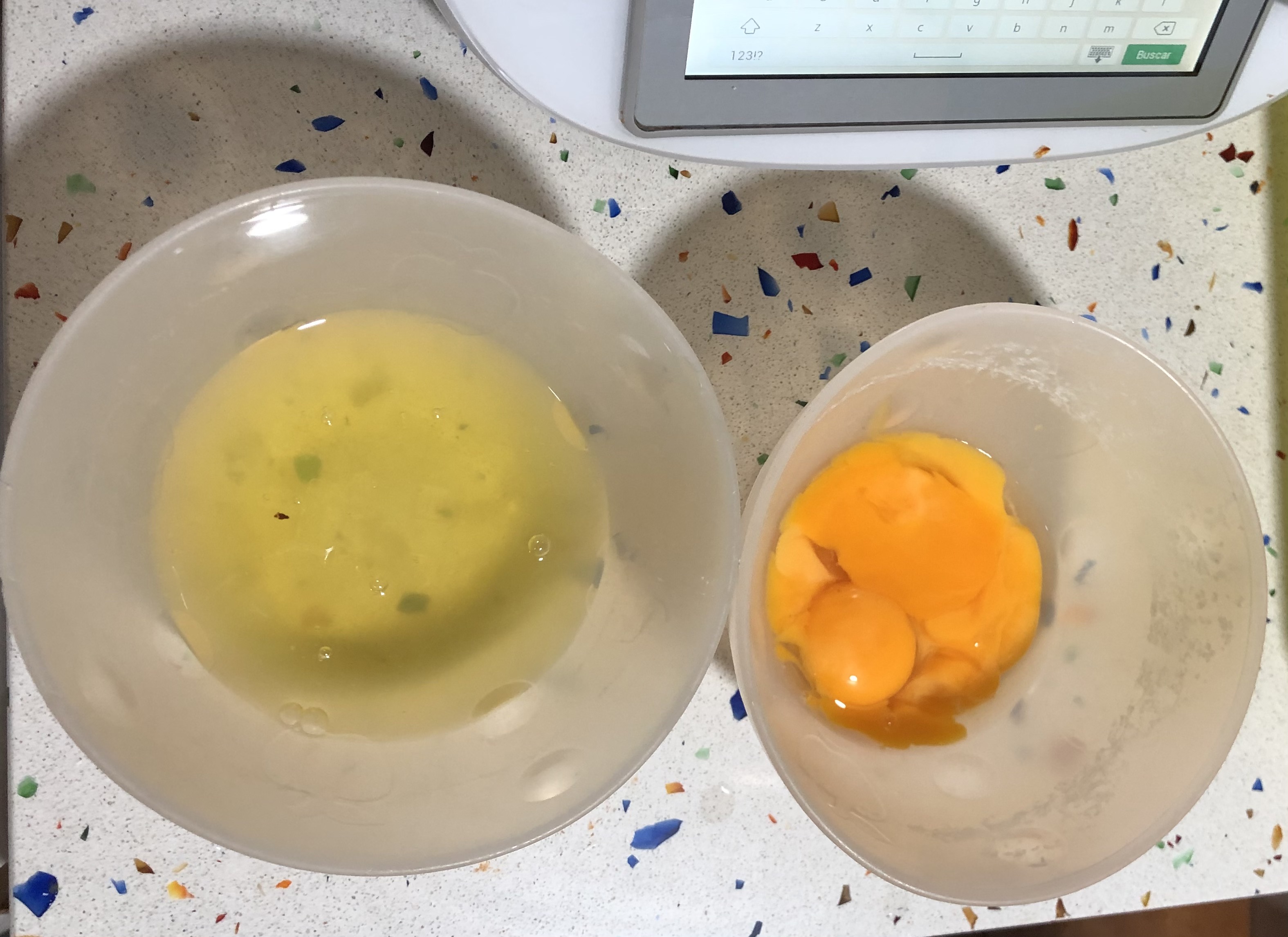 1- Colocamos la mariposa en las cuchillas, y echamos las claras y el pellizco de sal en el vaso del thermomix y programamos 3 min/ vel. 3.5 ( si los huevos están fríos poner 3.5min/ vel. 3.5; preparamos un bol y la mezcla que ha salido la colocamos ahi, y reservamos en el frigorífico,