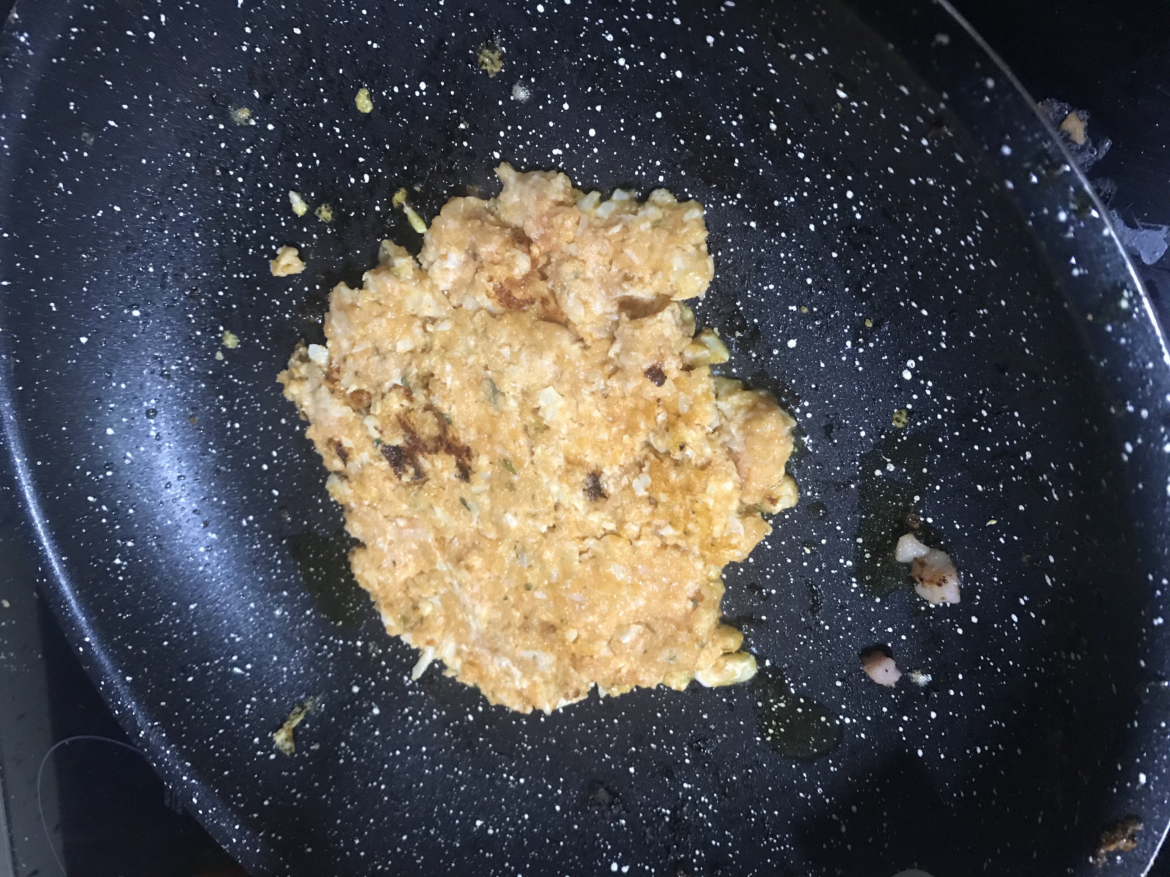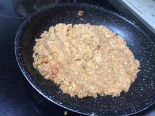 Entonces , pongo una sartén en fuego con un poco aceite una vez, caliente, echo un par de cucharadas de mezcla reservada en frigorífico y vamos dando forma de pizza