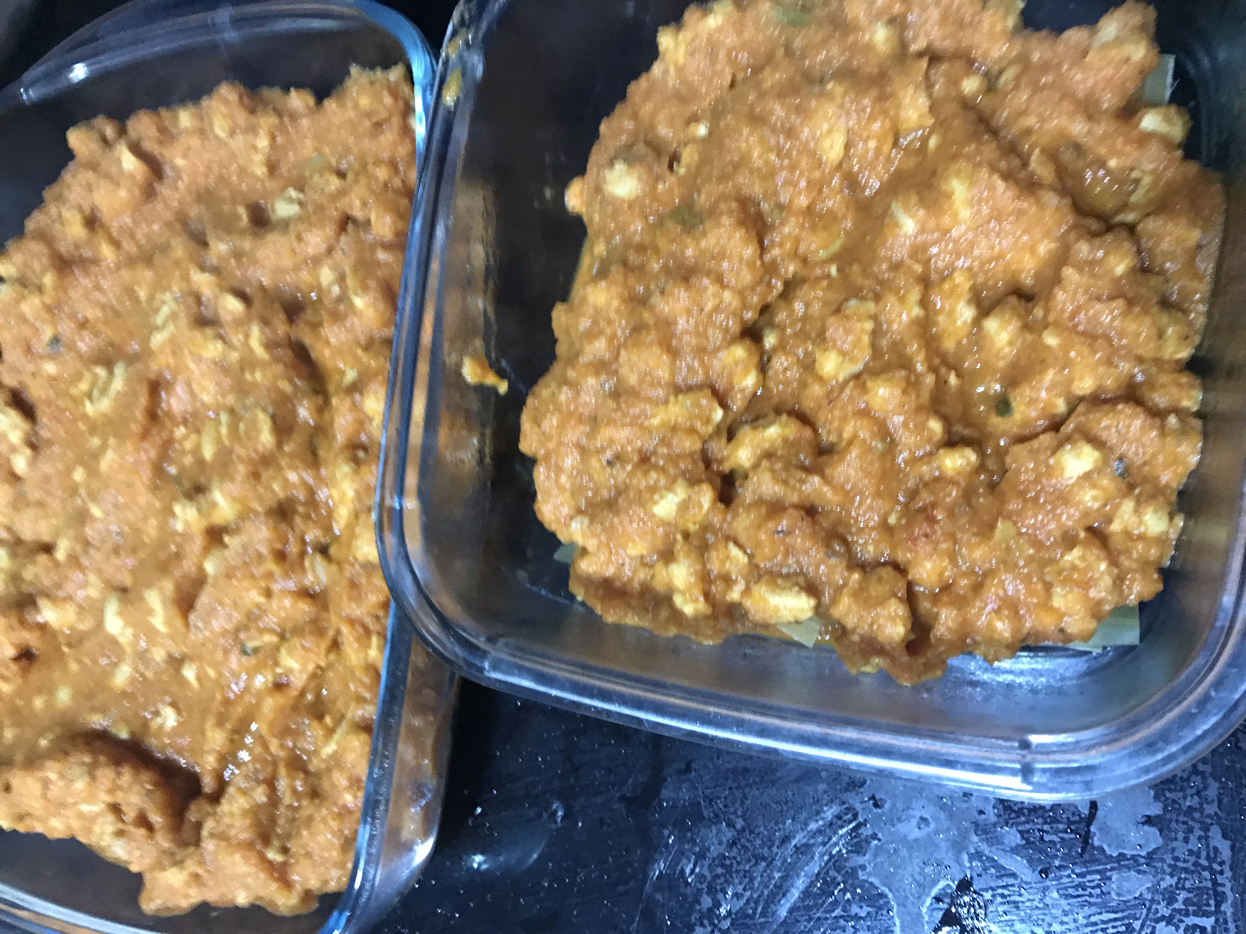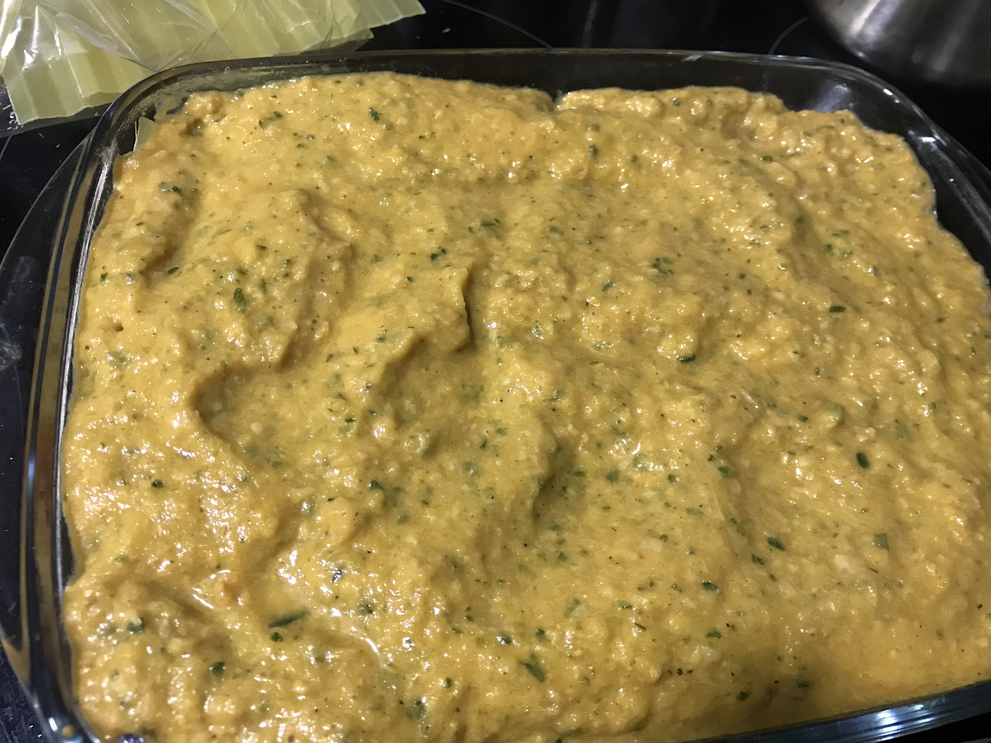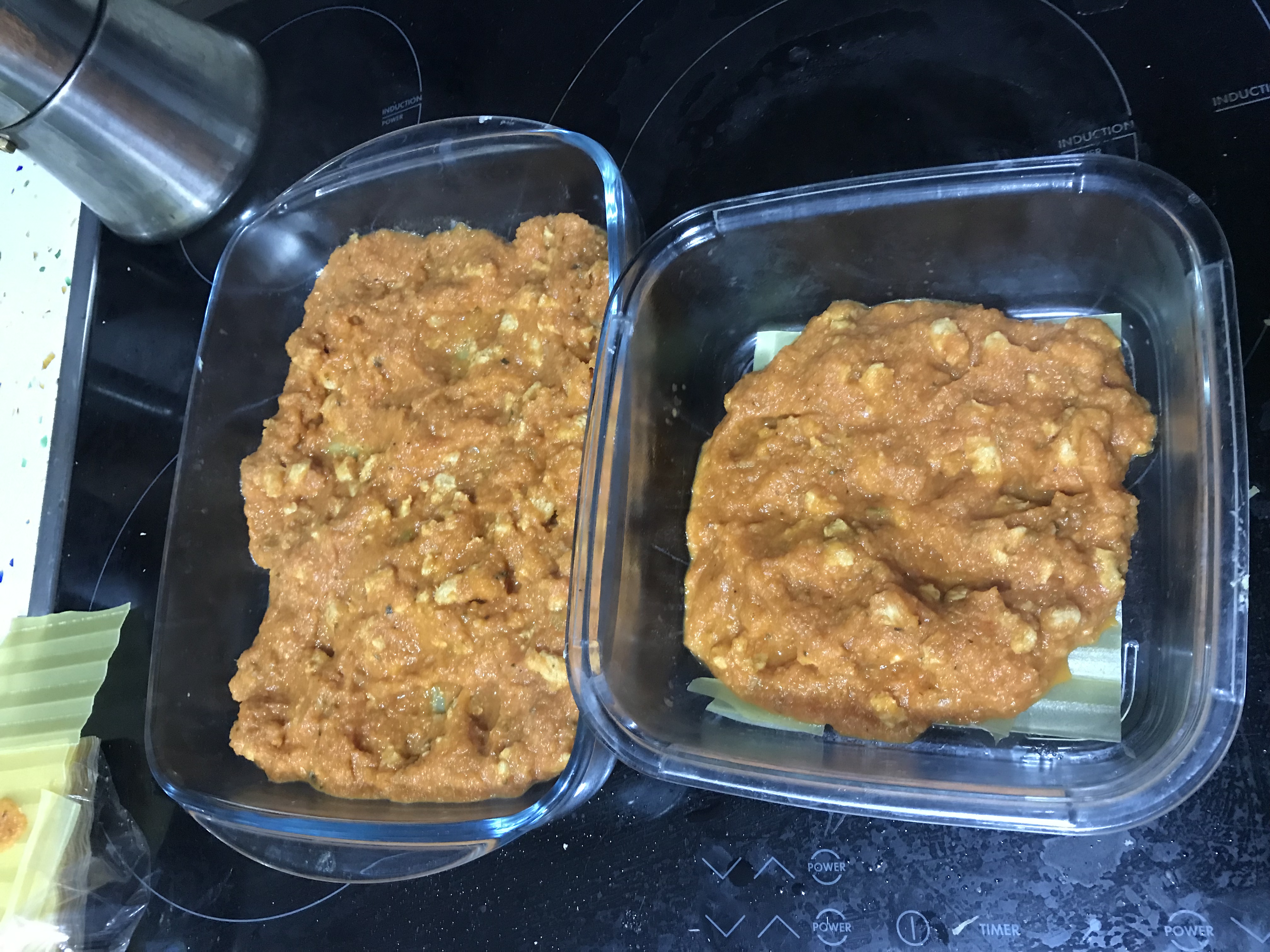 después otra capa de placas de lasaña y otra capa relleno y nos paramos de poner la siguiente capa de placas de lasaña hasta que pasen los minutos de cocinado de la bechamel vegetal.