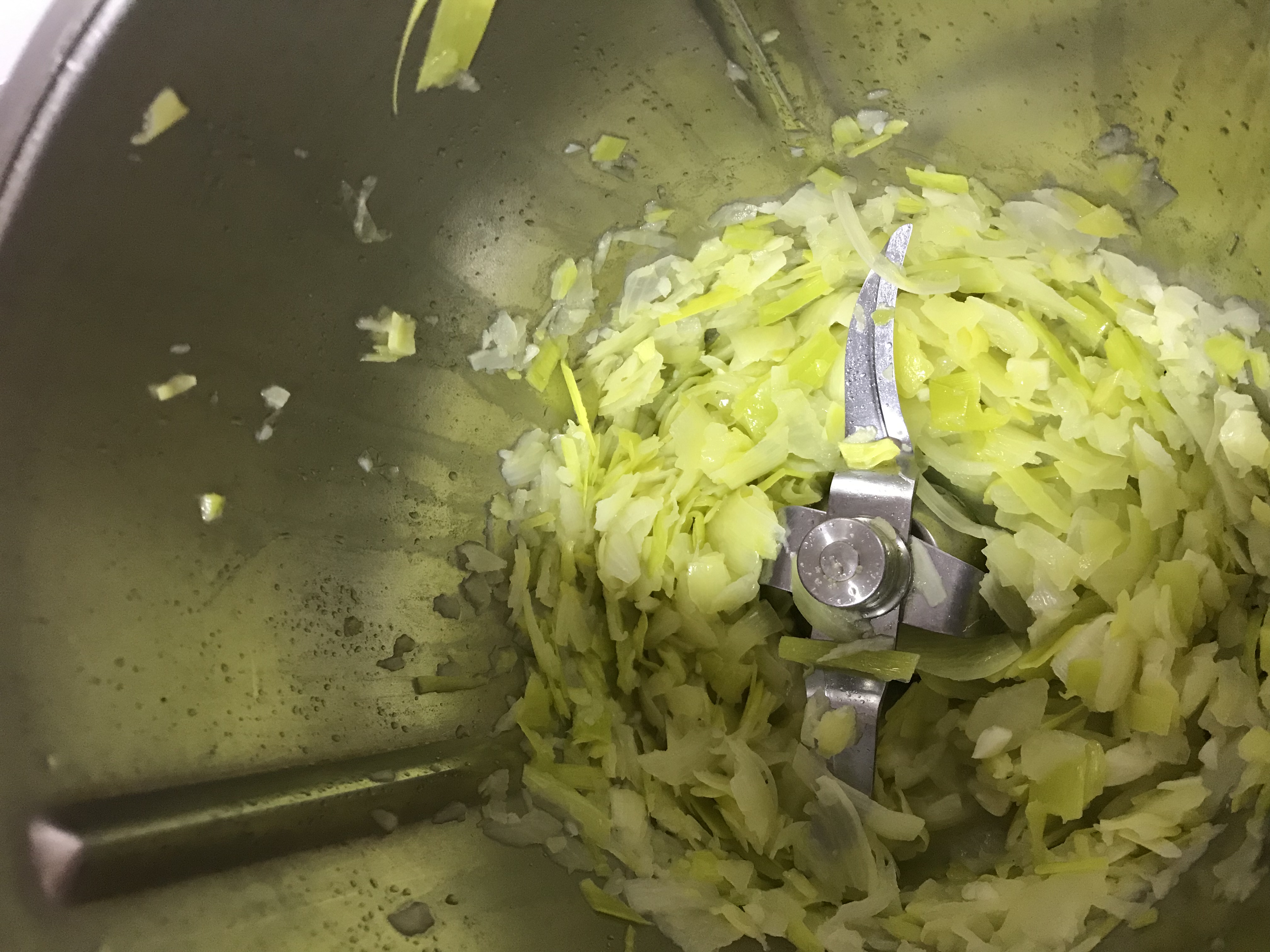 1. Echamos en el vaso el puerro,ajo,cebolla y aceite y troceamos 4seg/ vel 4.(bajamos los ingredientes hacia el fondo del vaso)