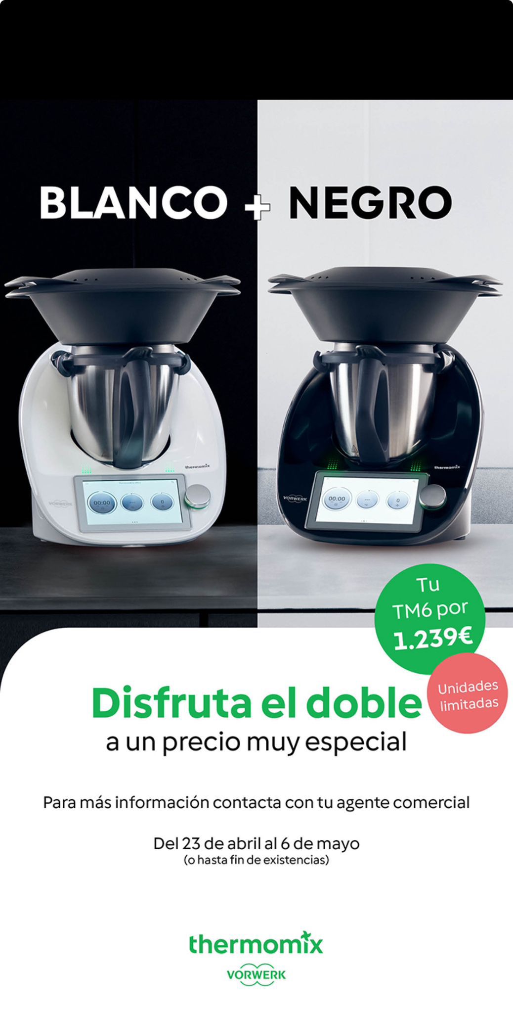 ¡Tenemos una oferta que no puedes dejar pasar! Renueva tu Thermomix y empieza a disfrutar de todas las ventajas del Thermomix TM6 con un descuento de 260 € y además recibirás un regalo muy especial de mi parte para que le saques el máximo partido. Esta oferta es válida hasta el 6 de mayo de 2024, no dejes pasar esta oportunidad de mejorar tu experiencia culinaria con Thermomix TM6 y aprovecha este increíble descuento.