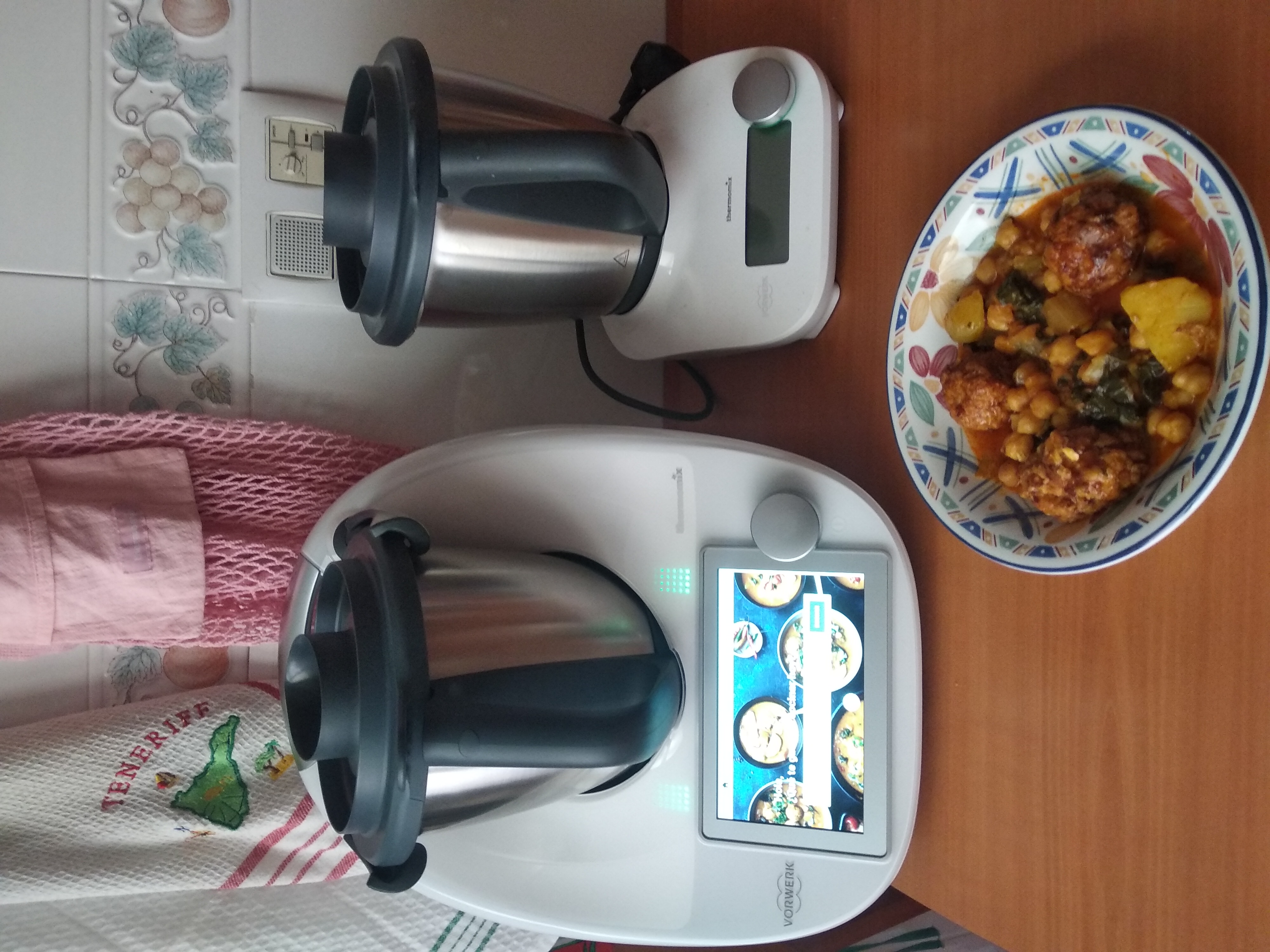 - Echamos los garbanzos cocidos, la patata y las albóndigas. Programamos 8 min/100ºgiro inverso/vel cuchara.